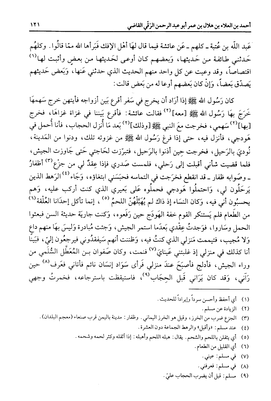 عبد الله بن عتبة كلهم عن عائشة فيما قال لها أهل الإفك فبرأها الله مما قالوا وكلهم حدثني طائفة من حديثها وبعضهم كان أوعى لحديثها من بعض وأثبت لها (1) اقتصاصا وقد وعيت عن كل واحد منهم الحديث الذي حدثني عنها وبعض حديثهم يصدق بعضا وإن كان بعضهم أوعا له من بعض قالت كان رسول الله (صلى الله عليه وسلم) إذا أراد أن يخرج في سفر أقرع بين أزواجه فأيتهن خرج سهمها خرج بها رسول الله (صلى الله عليه وسلم) معه (2) فقالت عائشة فأقرع بيننا في غزاة غزاها فخرج بها (2) سهمي فخرجت مع النبي (صلى الله عليه وسلم) وذلك (2) بعد ما أنزل الحجاب فأنا أحمل في هودجي فأنزل فيه حتى إذا فرغ رسول الله (صلى الله عليه وسلم) من غزوته تلك ودنوا من المدينة نودي بالرحيل فخرجت حين أذنوا بالرحيل فتبرزت لحاجتي حتى جاوزت الجيش فلما قضيت شأني أقبلت إلى رحلي فلمست صدري فإذا عقد لي من جزع (3) أظفار وصوابه ظفار قد انقطع فخرجت في التماسه فحبسني ابتغاؤه وجاء (4) الرهط الذين يرحلون لي واحتملوا هودجي فحملوه على بعيري الذي كنت أركب عليه وهم يحسبون أني فيه وكان النساء إذ ذاك لم يهبلهن اللحم (5) إنما تأكل إحدانا العلقة (6) من الطعام فلم يستنكر القوم خفة الهودج حين رفعوه وكنت جارية حديثة السن فبعثوا الحمل وساروا فوجدت عقدي بعدما استمر الجيش وجئت مبادرة وليس بها منهم داع ولا مجيب فتيممت منزلي الذي كنت فيه وظننت أنهم سيفقدوني فيرجعون إلي فبينا أنا كذلك في منزلي إذا غلبتني عيناي (7) فنمت وكان صفوان بن المعطل السلمي من وراء الجيش فأدلج فأصبح عند منزلي فرأى سواد إنسان نائم فأتاني فعرف (8) حين رآني وقد كان يراني قبل الحجاب (9) فاستيقظت باسترجاعه فخمرت وجهي