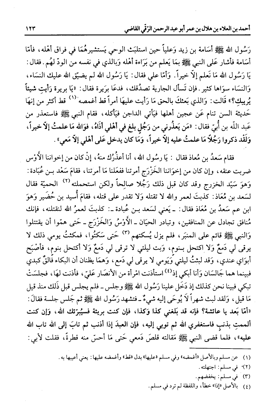 رسول الله (صلى الله عليه وسلم) أسامة بن زيد وعليا حين استلبث الوحي يستشيرهما في فراق أهله فأما أسامة فأشار على النبي (صلى الله عليه وسلم) بما يعلم من براءة أهله وبالذي في نفسه من الود لهم فقال يا رسول الله ما نعلم إلا خيرا وأما علي فقال يا رسول الله لم يضيق الله عليك النساء والنساء سواها كثير فإن تسأل الجارية تصدقك فدعا بريرة فقال يا بريرة رأيت شيئا يريبك قالت والذي بعثك بالحق ما رأيت عليها أمرا قط أغمصه (1) قط أكثر من إنها حديثة السن تنام عن عجين أهلها فيأتي الداجي فيأكله فقام النبي (صلى الله عليه وسلم) فاستعذر من عبد الله بن أبي فقال من يعذرني من رجل بلغ في أهلي أذاه فوالله ما علمت إلا خيرا ولقد ذكروا رجلا ما علمت عليه إلا خيرا وما كان يدخل على أهلي إلا معي فقام سعد بن معاذ فقال يا رسول الله أنا أعذرك منه إن كان من إخواننا الأوس ضربت عنقه وإن كان من إخواننا الخزرج أمرتنا ففعلنا ما أمرتنا فقام سعد بن عبادة وهو سيد الخزرج وقد كان قبل ذلك رجلا صالحا ولكن استحملته (2) الحمية فقال لسعد بن معاذ كذبت لعمر والله لا تقتله ولا تقدر على قتله فقام أسيد بن حضير وهو ابن عم سعد بن معاذ فقال يعني لسعد بن عبادة كذبت لعمر الله لنقتلنه فإنك منافق تجادل عن المنافقين وتبادر الحيان الأوس والخزرج حتى هموا أن يقتتلوا والنبي (صلى الله عليه وسلم) قائم على المنبر فلم يزل يسكتهم (3) حتى سكتوا فمكثت يومي ذلك لا يرقى لي دمع ولا اكتحل بنوم وبت ليلتي لا ترقى لي دمع ولا أكتحل بنوم فأصبح أبواي عندي وقد لبثت ليلتي ويومي لا يرقى لي دمع وهما يظنان أن البكاء فالق كبدي فبينما هما جالسان وأنا أبكي إذ (4) استأذنت امرأة من الأنصار علي فأذنت لها فجلست تبكي فبينا نحن كذلك إذ دخل علينا رسول الله (صلى الله عليه وسلم) وجلس فلم يجلس قبل ذلك منذ قيل ما قيل ولقد لبث شهرا لا يوحى إليه شئ فتشهد رسول الله (صلى الله عليه وسلم) ثم جلس جلسة فقال أما بعد يا عائشة فإنه قد بلغني كذا وكذا فإن كنت بريئة فسيبرئك الله وإن كنت ألممت بذنب فاسغفري الله ثم توبي إليه فإن العبد إذا أذنب ثم تاب إلى الله تاب الله عليه فلما قضى النبي (صلى الله عليه وسلم) مقالته قلص دمعي حتى ما أحس منه قطرة فقلت لأبي