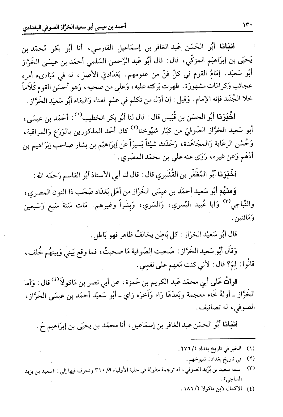 أنبأنا أبو الحسن عبد الغافر بن إسماعيل الفارسي أنا أبو بكر محمد بن يحيى بن إبراهيم المزكي قال قال أبو عبد الرحمن السلمي أحمد بن عيسى الخراز أبو سعيد إمام القوم في كل فن من علومهم بغدادي الأصل له في مبادئ أمره عجائب وكرامات مشهورة ظهرت بركته عليه وعلى من صحبه وهو أحسن القوم كلاما خلا الجنيد فإنه الإمام وقيل إن أول من تكلم في علم الفناء والبقاء أبو سعيد الخراز أخبرنا أبو الحسن بن قبيس قال قال لنا أبو بكر الخطيب (1) أحمد بن عيسى أبو سعيد الخراز الصوفي من كبار شيوخنا (2) كان أحد المذكورين بالورع والمراقبة وحسن الرعاية والمجاهدة وحدث شيئا يسيرا عن إبراهيم بن بشار صاحب إبراهيم بن أدهم وعن غيره روى عنه علي بن محمد المصري أخبرنا أبو المظفر بن القشيري قال قال لنا أبي الأستاذ أبو القاسم رحمه الله ومنهم أبو سعيد أحمد بن عيسى الخراز من أهل بغداد صحب ذا النون المصري والنباجي (3) وأبا عبيد البسري والسري وبشرا وغيرهم مات سنة سبع وسبعين ومائتين قال أبو سعيد الخراز كل باطن يخالف ظاهر فهو باطل وقال أبو سعيد الخراز صحبت الصوفية ما صحبت فما وقع بيني وبينهم خلف قالوا لن قال لأني كنت معهم على نفسي قرأت على أبي محمد عبد الكريم بن حمزة عن أبي نصر بن ماكولا (4) قال وأما الخراز أوله خاء معجمة وبعدها راء وآخره زاي أبو سعيد أحمد بن عيسى الخراز الصوفي له تصانيف أنبأنا أبو الحسن عبد الغافر بن إسماعيل أنا محمد بن يحيى بن إبراهيم
