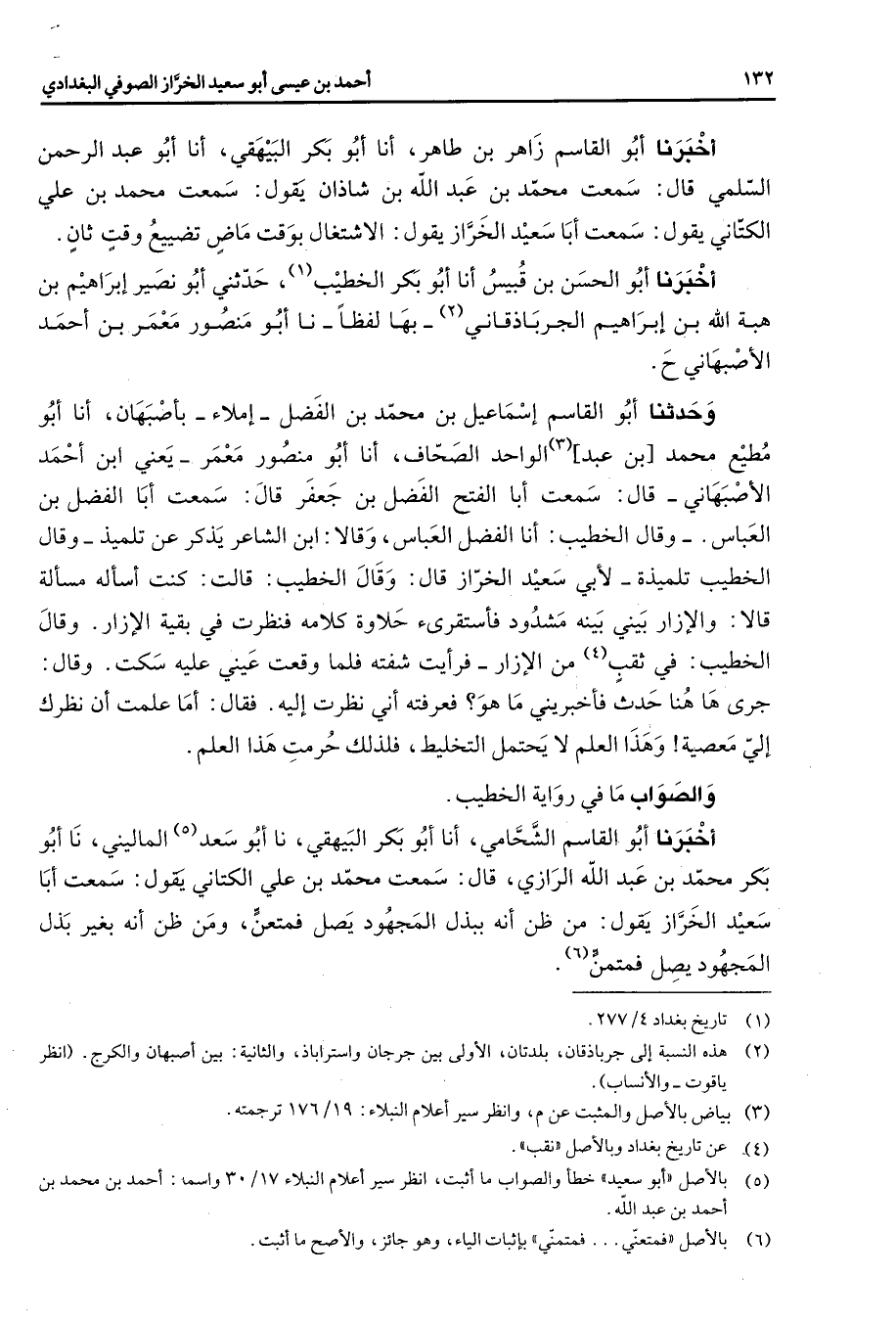 أخبرنا أبو القاسم زاهر بن طاهر أنا أبو بكر البيهقي أنا أبو عبد الرحمن السلمي قال سمعت محمد بن عبد الله بن شاذان يقول سمعت محمد بن علي الكتاني يقول سمعت أبا سعيد الخراز يقول الاشتغال بوقت ماض تضييع وقت ثان أخبرنا أبو الحسن بن قبيس أنا أبو بكر الخطيب (1) حدثني أبو نصير إبراهيم بن هبة الله بن إبراهيم الجرباذقاني (2) بها لفظا نا أبو منصور معمر بن أحمد الأصبهاني وحدثنا أبو القاسم إسماعيل بن محمد بن الفضل إملاء بأصبهان أنا أبو مطيع محمد بن عبد (3) الواحد الصحاف أنا أبو منصور معمر يعني ابن أحمد الأصبهاني قال سمعت أبا الفتح الفضل بن جعفر قال سمعت أبا الفضل بن العباس وقال الخطيب أنا الفضل العباس وقالا ابن الشاعر يذكر عن تلميذ وقال الخطيب تلميذه لأبي سعيد الخراز قال وقال الخطيب قالت كنت أسأله مسألة قالا والإزار بيني بينه مشدود فأستقرئ حلاوة كلامه فنظرت في بقية الإزار وقال الخطيب في ثقب (4) من الإزار فرأيت شفته فلما وقعت عيني عليه سكت وقال جرى ها هنا حدث فأخبرني ما هو فعرفته أني نظرت إليه فقال أما علمت أن نظرك إلي معصية وهذا العلم لا يحتمل التخليط فلذلك حرمت هذا العلم والصواب ما في رواية الخطيب أخبرنا أبو القاسم الشحامي أنا أبو بكر البيهقي نا أبو سعد (5) الماليني نا أبو بكر محمد بن عبد الله الرازي قال سمعت محمد بن علي الكتاني يقول سمعت أبا سعيد الخراز يقول من ظن أنه ببذل المجهود يصل فمتعن ومن ظن أنه بغير بذل المجهود يصل فمتمن (6)
