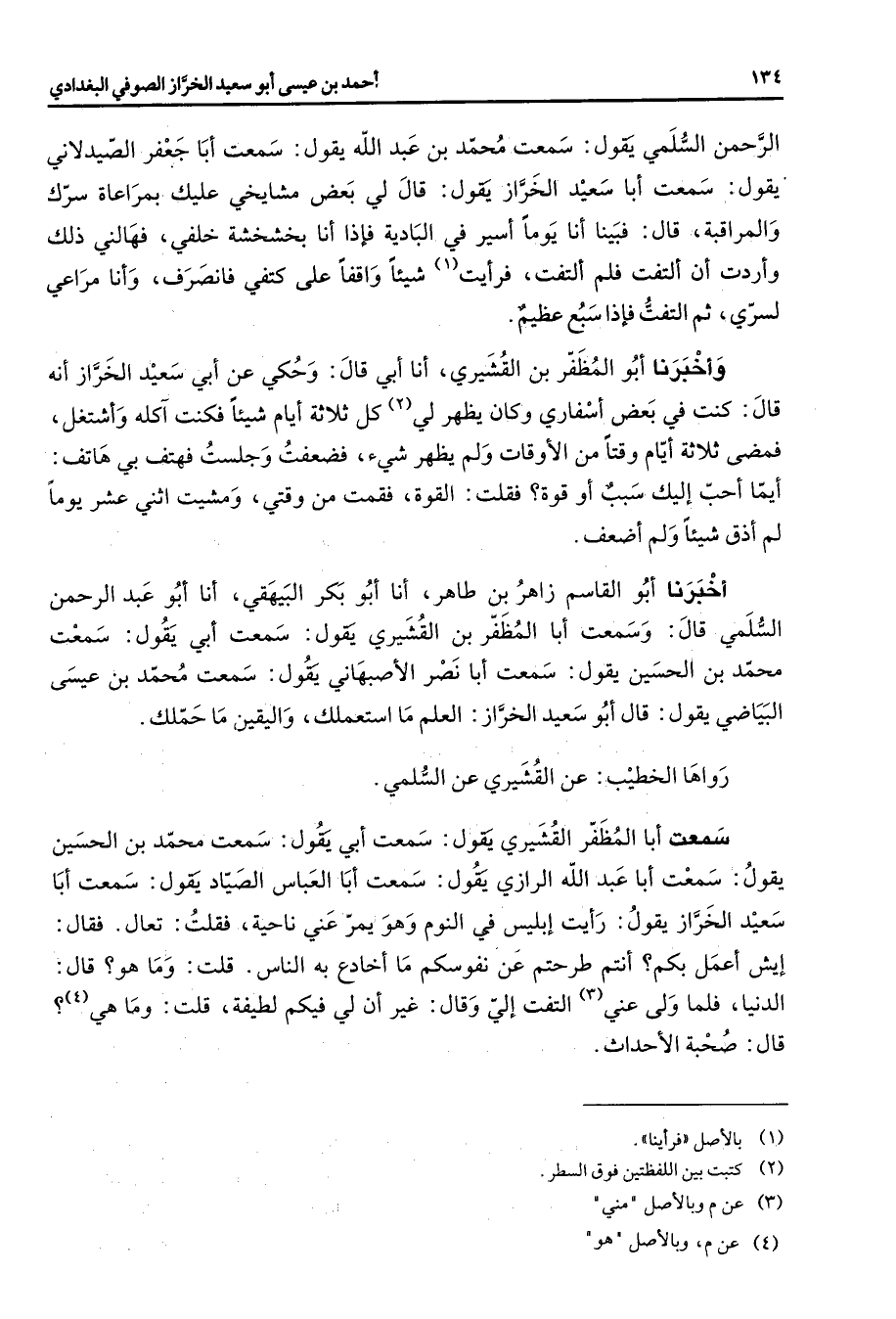 الرحمن السلمي يقول سمعت محمد بن عبد الله يقول سمعت أبا جعفر الصيدلاني يقول سمعت أبا سعيد الخراز يقول قال لي بعض مشايخي عليك بمراعاة سرك والمراقبة قال فبينا أنا يوما أسير في البادية فإذا أنا بخشخشة خلفي فهالني ذلك وأردت أن ألتفت فلم ألتفت فرأيت (1) شيئا واقفا على كتفي فانصرف وأنا مراعي لسري ثم التفت فإذا سبع عظيم وأخبرنا أبو المظفر بن القشيري أنا أبي قال وحكى عن أبي سعيد الخراز أنه قال كنت في بعض أسفاري وكان يظهر لي (2) كل ثلاثة أيام شيئا فكنت آكله وأشتغل فمضى ثلاثة أيام وقتا من الأوقات ولم يظهر شئ فضعفت وجلست فهتف بي هاتف أيما أحب إليك سبب أو قوة فقلت القوة فقمت من وقتي ومشيت اثني عشر يوما لم أذق شيئا ولم أضعف أخبرنا أبو القاسم زاهر بن طاهر أنا أبو بكر البيهقي أنا أبو عبد الرحمن السلمي قال وسمعت أبا المظفر بن القشيري يقول سمعت أبي يقول سمعت محمد بن الحسين يقول سمعت أبا نصر الأصبهاني يقول سمعت محمد بن عيسى البياضي يقول قال أبو سعيد الخراز العلم ما استعملك واليقين ما حملك رواها الخطيب عن القشيري عن السملي سمعت أبا المظفر القشيري يقول سمعت أبي يقول سمعت محمد بن الحسين يقول سمعت أبا عبد الله الرازي يقول سمعت أبا العباس الصياد يقول سمعت أبا سعيد الخراز يقول رأيت إبليس في النوم وهو يمر عني ناحية فقلت تعال فقال إيش أعمل بكم أنتم طرحتم عن نفوسكم ما أخادع به الناس قلت وما هو قال الدنيا فلما ولى عني (3) التفت إلي وقال غير أن لي فيكم لطيفة قلت وما هي (4) قال صحبة الأحداث