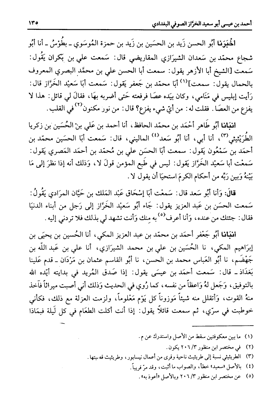 أخبرنا أبو الحسن زيد بن الحسين بن زيد بن حمزة الموسوي بطوس أنا أبو شجاع محمد بن سعدان الشيرازي المقاريضي قال سمعت علي بن بكران يقول سمعت الشيخ أبا الأزهر يقول سمعت أبا الحسن علي بن محمد البصري المعروف بالحمال يقول سمعت (1) أبا محمد بن جعفر يقول سمعت أبا سعيد الخراز قال رأيت إبليس في منامي وكان بيده عصا فرفعته حتى أضربه بها فقال لي قائل هذا لا يفزع من العصا فقلت له من أي شئ يفزع قال من نور مكنون (2) في القلب أنبأنا أبو طاهر أحمد بن محمد الحافظ أنا أحمد بن علي بن الحسين بن زكريا الطريثيثي (3) أنا أبي أنا أبو سعد (4) الماليني قال سمعت أبا الحسين محمد بن أحمد بن سمعون يقول سمعت أبا الحسن علي بن محمد بن أحمد المصري يقول سمعت أبا سعيد الخراز يقول ليس في طبع المؤمن قول لا وذلك أنه إذا نظر إلى ما بينه وبين ربه من أحكام الكرم استحيا أن يقول لا قال وأنا أبو سعد قال سمعت أبا إسحاق عبد الملك بن حيان المرادي يقول سمعت الحسن بن عبد العزيز يقول جاء أبو سعيد الخراز إلى رجل من أبناء الدنيا فقال جئتك من عنده وأنا أعرف (5) به منك وأنت تشهد لي بذلك فلا تردني إليه أنبأنا أبو جعفر أحمد بن محمد بن عبد العزيز المكي أنا الحسين بن يحيى بن إبراهيم المكي نا الحسين بن علي بن محمد الشيرازي أنا علي بن عبد الله بن جهضم نا أبو العباس محمد بن الحسن نا أبو القاسم عثمان بن مردان قدم علينا بغداذ قال سمعت أحمد بن عيسى يقول إذا صدق المريد في بدايته أيده الله بالتوفيق وجعل له واعظا من نفسه كما روي في الحديث وذلك أني أصبت ميراثا فآخذ منه القوت وأتقلل منه شيئا موزونا كل يوم معلوما ولزمت العزلة مع ذلك فكأني خوطبت في سري ثم سمعت قائلا يقول إذا أنت أكلت الطعام في كل ليلة فبماذا