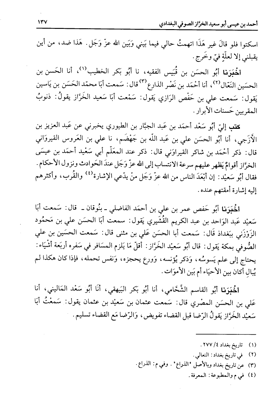 اسكتوا فلو قال غير هذا اتهمت حالي فيما بيني وبين الله عز وجل هذا ضد من أين يقبلني إلا لعلة في وخرج أخبرنا أبو الحسن بن قبيس الفقيه نا أبو بكر الخطيب (1) أنا الحسن بن الحسين النعال (2) أنا أحمد بن نصر الذراع (3) قال سمعت أبا محمد الحسن بن ياسين يقول سمعت علي بن حفص الرازي يقول سمعت أبا سعيد الخراز يقول ذنوب المقربين حسنات الأبرار كتب إلي أبو سعد أحمد بن عبد الجبار بن الطيوري يخبرني عن عبد العزيز بن الأزجي أنا أبو الحسن علي بن عبد الله بن جهضم نا علي بن العروس القيرواني قال ذكر أحمد بن شاكر القيرواني قال ذكر عند المعلم أبي سعيد أحمد بن عيسى الخراز أقوام يظهر عليهم سرعة الانتساب إلى الله عز وجل عند الحوادث ونزول الأحكام فقال أبو سعيد إن أبعد الناس من الله عز وجل من يدعي الإشارة (4) والقرب وأكثرهم إليه إشارة أمقتهم عنده أخبرنا أبو حفص عمر بن علي بن أحمد الفاضلي بنوقان قال سمعت أبا سعيد عبد الواحد بن عبد الكريم القشيري يقول سمعت أبا الحسن علي بن محمود الزوزني ببغداذ قال سمعت أبا الحسن علي بن مثنى قال سمعت الحسين بن علي الصوفي بمكة يقول قال أبو سعيد الخراز أقل ما يلزم المسافر في سفره أربعة أشياء يحتاج إلى علم يسوسه وذكر يؤنسه وورع يحجزه ونفس تحمله فإذا كان هكذا لم يبال أكان بين الأحياء أم بين الأموات أخبرنا أبو القاسم الشحامي أنا أبو بكر البيهقي أنا أبو سعد الماليني أنا علي بن الحسن المصري قال سمعت عثمان بن سعيد بن عثمان يقول سمعت أبا سعيد الخراز يقول الرضا قبل القضاء تفويض والرضا مع القضاء تسليم *