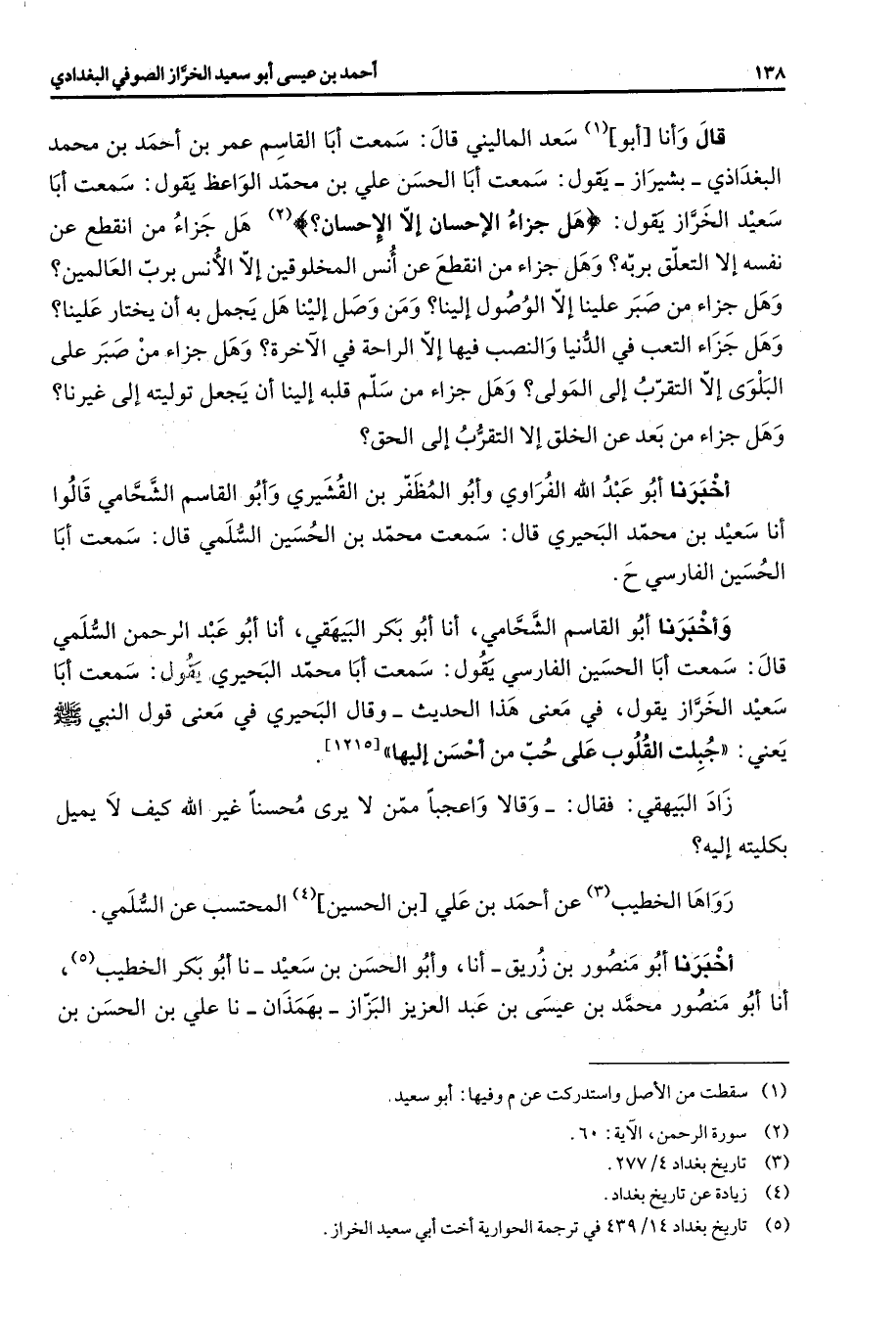 قال وأنا أبو (1) سعد الماليني قال سمعت أبا القاسم عمر بن أحمد بن محمد البغداذي بشيراز يقول سمعت أبا الحسن علي بن محمد الواعظ يقول سمعت أبا سعيد الخراز يقول " هل جزاء الإحسان إلا الإحسان " (2) هل جزاء من انقطع عن نفسه إلا التعلق بربه وهل جزاء من انقطع عن أنس المخلوقين إلا الأنس برب العالمين وهل جزاء من صبر علينا إلا الوصول إلينا ومن وصل إلينا هل يجمل به أن يختار علينا وهل جزاء التعب في الدنيا والنصب فيها إلا الراحة في الآخرة وهل جزاء من صبر على البلوى إلا التقرب إلى المولى وهل جزاء من سلم قلبه إلينا أن يجعل توليته إلى غيرنا وهل جزاء من بعد عن الخلق إلا التقرب إلى الحق أخبرنا أبو عبد الله الفراوي وأبو المظفر بن القشيري وأبو القاسم الشحامي قالوا أنا سعيد بن محمد البحيري قال سمعت محمد بن الحسين السلمي قال سمعت أبا الحسين الفارسي وأخبرنا أبو القاسم الشحامي أنا أبو بكر البيهقي أنا أبو عبد الرحمن السلمي قال سمعت أبا الحسين الفارسي يقول سمعت أبا محمد البحيري يقول سمعت أبا سعيد الخراز يقول في معنى هذا الحديث وقال البحيري في معنى قول النبي (صلى الله عليه وسلم) يعني جبلت القلوب على حب من أحسن إليها زاد البيهقي فقال وقالا واعجبا ممن لا يرى محسنا غير الله كيف لا يميل بكليته إليه رواها الخطيب (3) عن أحمد بن علي بن الحسين (4) المحتسب عن السلمي أخبرنا أبو منصور بن زريق أنا وأبو الحسن بن سعيد نا أبو بكر الخطيب (5) أنا أبو منصور محمد بن عيسى بن عبد العزيز البزاز بهمذان نا علي بن الحسن بن