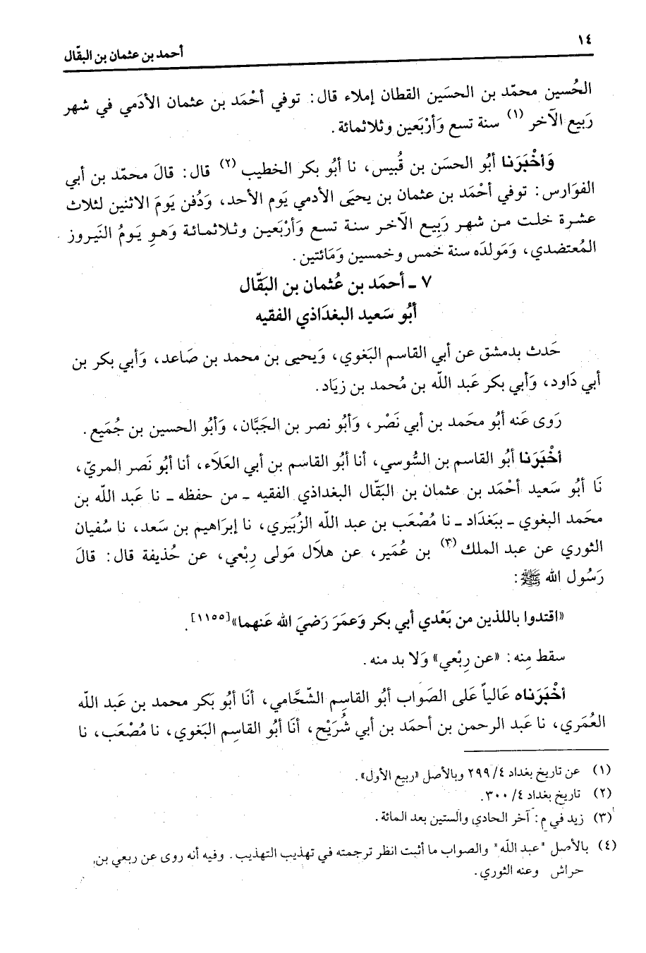 الحسين محمد بن الحسين القطان إملاء قال توفي أحمد بن عثمان الأدمي في شهر ربيع الآخر (1) سنة تسع وأربعين وثلاثمائة وأخبرنا أبو الحسن بن قبيس نا أبو بكر الخطيب (2) قال قال محمد بن أبي الفوارس توفي أحمد بن عثمان بن يحيى الأدمي يوم الأحد ودفن يوم الاثنين لثلاث عشرة خلت من شهر ربيع الآخر سنة تسع وأربعين وثلاثمائة وهو يوم النيروز المعتضدي ومولده سنة خمس وخمسين ومائتين 7 - أحمد بن عثمان بن البقال أبو سعيد البغداذي الفقيه حدث بدمشق عن أبي القاسم البغوي ويحيى بن محمد بن صاعد وأبي بكر بن أبي داود وأبي بكر عبد الله بن محمد بن زياد روى عنه أبو محمد بن أبي نصر وأبو نصر بن الجبان وأبو الحسين بن جميع أخبرنا أبو القاسم بن السوسي أنا أبو القاسم بن أبي العلاء أنا أبو نصر المري نا أبو سعيد أحمد بن عثمان بن البقال البغداذي الفقيه من حفظه نا عبد الله بن محمد البغوي ببغداد نا مصعب بن عبد الله الزبيري نا إبراهيم بن سعد نا سفيان الثوري عن عبد الملك (3) بن عمير عن هلال مولى ربعي عن حذيفة قال قال رسول الله (صلى الله عليه وسلم) اقتدوا باللذين من بعدي أبي بكر وعمر Bهما