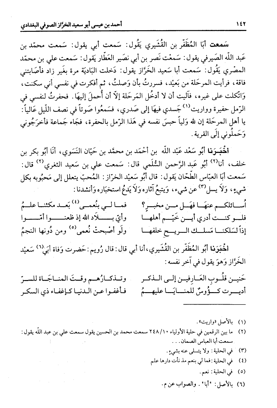 سمعت أبا المظفر بن القشيري يقول سمعت ابي يقول سمعت محمد بن عبد الله الصيرفي يقول سمعت نصر بن أبي نصير العطار يقول سمعت علي بن محمد المصري يقول سمعت أبا سعيد الخراز يقول دخلت البادية مرة بغير زاد فأصابتني فاقة فرأيت المرحلة من بعيد فسررت بأن وصلت ثم أفكرت في نفسي أني سكنت واتكلت على غيره فآليت أن لا أدخل المرحلة إلا أن أحمل إليها فحفرت لنفسي في الرمل حفيرة وواريت (1) جسدي فيها إلى صدري فسمعوا صوتا في نصف الليل عاليا يا أهل المرحلة إن لله وليا حبس نفسه في هذا الرمل بالحفرة فجاء جماعة فأخرجوني وحملوني إلى القرية أخبرنا أبو سعد عبد الله بن أحمد بن محمد بن حيان النسوي أنا أبو بكر بن خلف أنا (2) أبو عبد الرحمن السلمي قال سمعت علي بن سعيد الثغري (2) قال سمعت أبا العباس الطحان يقو قال أبو سعيد الخراز المحب يتعلل إلى محبوبة بكل شئ ولا يسل (3) عن شئ ويتبع آثاره ولا يدع استخباره وأنشدنا * اسائلكم عنها فهل من مخبر * فمالي بنعمى (4) بعد مكثنا علم فلو كنت أدري أين خيم أهلها * وأي بلاد الله إذ ظعنوا أموا إذا لسلكنا مسلك الريح خلفها * ولو أصبحت نعمى (5) ومن دونها النجم * أخبرنا أبو المظفر بن القشيري أنا أبي قال قال رويم حضرت وفاة أبي (6) سعيد الخراز وهو يقول في آخر نفسه * حنين قلوب العارفين إلى الذكر * وتذكارهم وقت المناجاة للسر أديرت كؤوس للمنايا عليهم * فأغفوا عن الدنيا كإغفاء ذي السكر