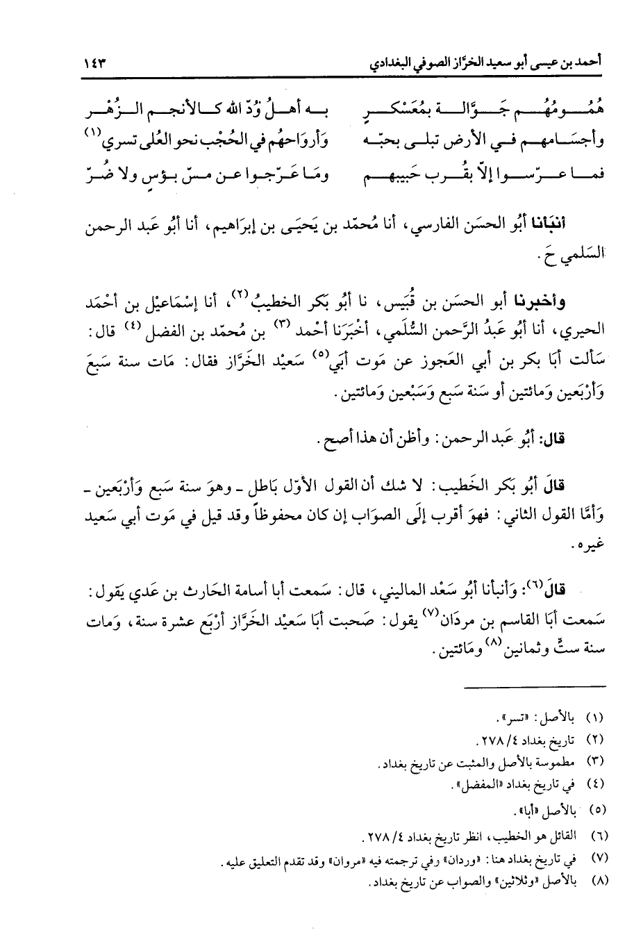 همومهم جوالة بمعسكر * به أهل ود الله كالأنجم الزهر وأجسامهم في الأرض تبلى بحبه * وأرواحهم في الحجب نحو العلى تسري (1) فما عرسوا إلا بقرب حبيبهم * وما عرجوا عن مس بؤس ولا ضر * أنبأنا أبو الحسن الفارسي أنا محمد بن يحيى بن إبراهيم أنا أبو عبد الرحمن السلمي وأخبرنا أبو الحسن بن قبيس نا أبو بكر الخطيب (2) أنا إسماعيل بن أحمد الحيري أنا أبو عبد الرحمن السلمي أخبرنا أحمد (3) بن محمد بن الفضل (4) قال سألت أبا بكر بن أبي العجوز عن موت أبي (5) سعيد الخراز فقال مات سنة سبع وأربعين ومائتين أو سنة سبع وسبعين ومائتين قال أبو عبد الرحمن وأظن أن هذا أصح قال أبو بكر الخطيب لا شك أن القول الأول باطل وهو سنة سبع وأربعين وأما القول الثاني فهو أقرب إلى الصواب إن كان محفوظا وقد قيل في موت أبي سعيد غيره قال (6) وأنبأنا أبو سعد الماليني قال سمعت أبا أسامة الحارث بن عدي يقول سمعت أبا القاسم بن مردان (7) يقول صحبت أبا سعيد الخراز أربع عشرة سنة ومات سنة ست وثمانين (8) ومائتين