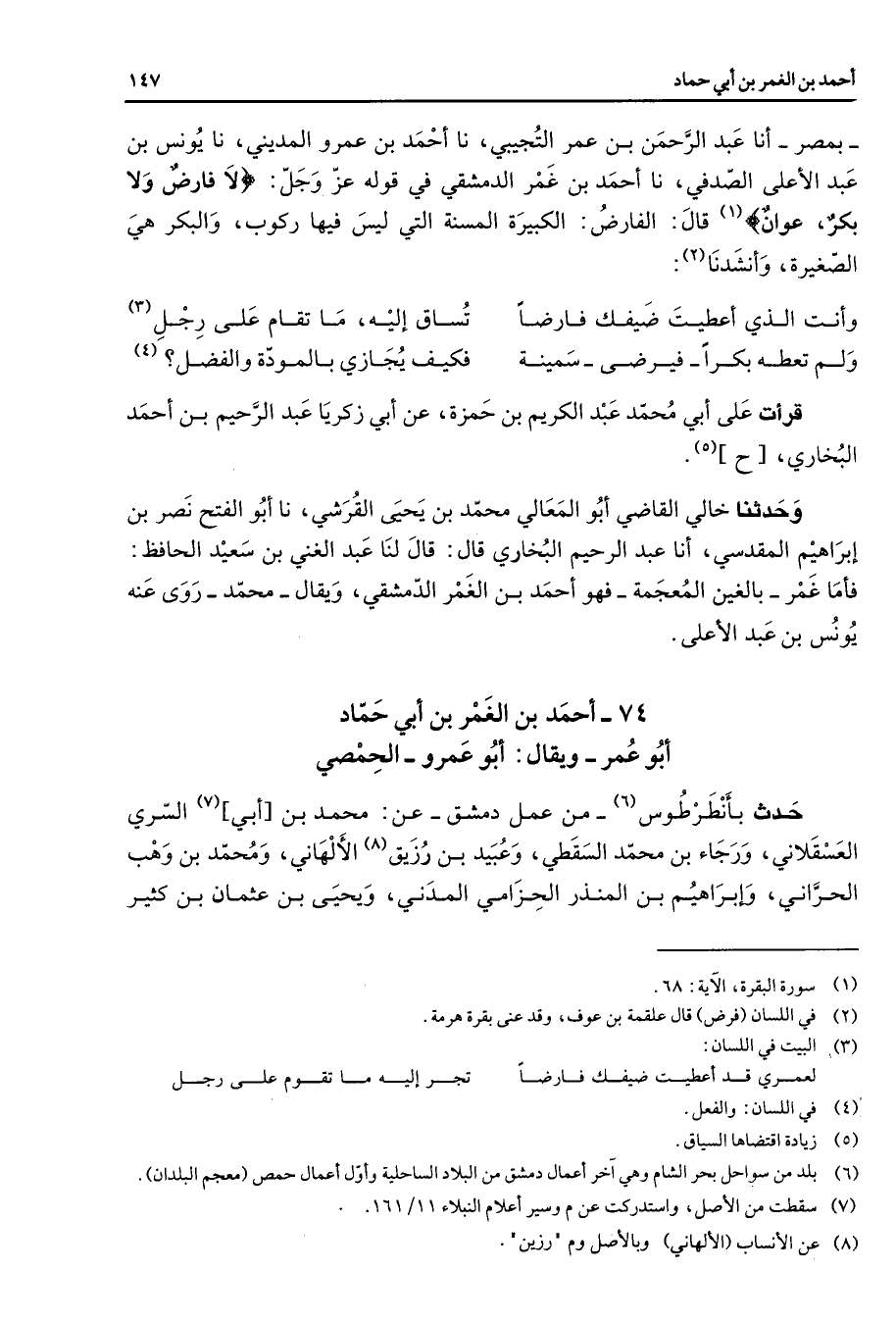 بمصر أنا عبد الرحمن بن عمر التجيبي نا أحمد بن عمرو المديني نا يونس بن عبد الأعلى الصدفي نا أحمد بن غمر الدمشقي في قوله عز وجل " لا فارض ولا بكر عوان " (1) قال الفارض الكبيرة المسنة التي ليس فيها ركوب والبكر هي الصغيرة وأنشدنا (2) * وأنت الذي أعطيت ضيفك فارضا * تساق إليه ما تقام على رجل (3) ولم تعطه بكرا فيرضى سمينة * فكيف يجازي بالمودة والفضل * (4) قرأت على أبي محمد عبد الكريم بن حمزة عن أبي زكريا عبد الرحيم بن أحمد البخاري (5) وحدثنا خالي القاضي أبو المعالي محمد بن يحيى القرشي نا أبو الفتح نصر بن إبراهيم المقدسي أنا عبد الرحيم البخاري قال قال لنا عبد الغني بن سعيد الحافظ فأما غمر بالغين المعجمة فهو أحمد بن الغمر الدمشقي ويقال محمد روى عنه يونس بن عبد الأعلى