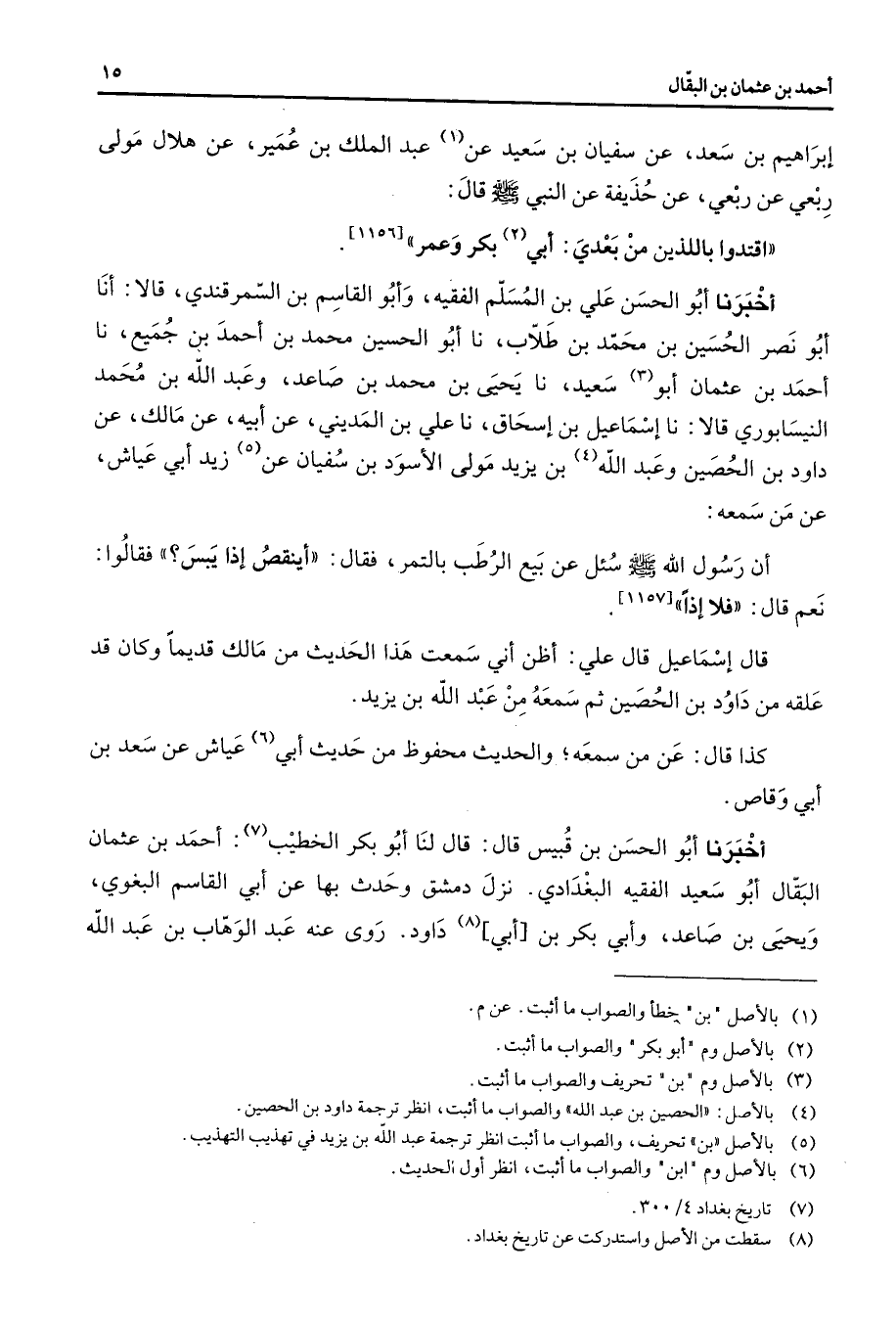 [1156] أخبرنا أبو الحسن علي بن المسلم الفقيه وأبو القاسم بن السمرقندي قالا أنا أبو نصر الحسين بن محمد بن طلاب نا أبو الحسين محمد بن أحمد بن جميع نا أحمد بن عثمان أبو (3) سعيد نا يحيى بن محمد بن صاعد وعبد الله بن محمد النيسابوري قالا نا إسماعيل بن إسحاق نا علي بن المديني عن أبيه عن مالك عن داود بن الحصين وعبد الله (4) بن يزيد مولى الأسود بن سفيان عن زيد أبي عياش عن من سمعه أن رسول الله (صلى الله عليه وسلم) سئل عن بيع الرطب بالتمر فقال أينقص إذا يبس فقالوا نعم قال فلا إذا