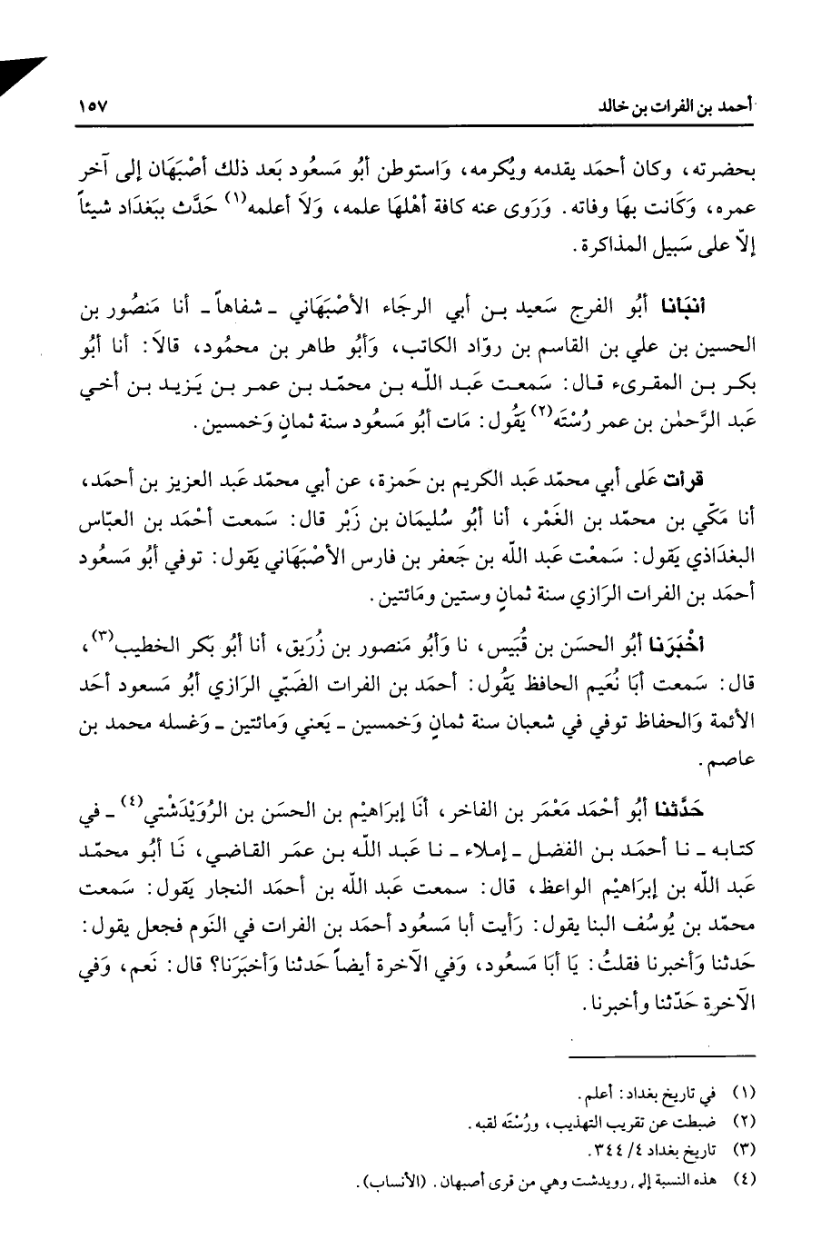 بحضرته وكان أحمد يقدمه ويكرمه واستوطن أبو مسعود بعد ذلك أصبهان إلى آخر عمره وكانت بها وفاته وروى عنه كافة أهلها علمه ولا أعلمه (1) حدث ببغداد شيئا إلا على سبيل المذاكرة أنبأنا أبو الفرج سعيد بن أبي الرجاء الأصبهاني شفاها أنا منصور بن الحسين بن علي بن القاسم بن رواد الكاتب وأبو طاهر بن محمود قالا أنا أبو بكر بن المقرئ قال سمعت عبد الله بن محمد بن عمر بن يزيد بن أخي عبد الرحمن بن عمر رسته (2) يقول مات أبو مسعود سنة ثمان وخمسين قرأت على أبي محمد عبد الكريم بن حمزة عن أبي محمد عبد العزيز بن أحمد أنا مكي بن محمد بن الغمر أنا أبو سليمان بن زبر قال سمعت أحمد بن العباس البغداذي يقول سمعت عبد الله بن جعفر بن فارس الأصبهاني يقول توفي أبو مسعود أحمد بن الفرات الرازي سنة ثمان وستين ومائتين أخبرنا أبو الحسن بن قبيس نا وأبو منصور بن زريق أنا أبو بكر الخطيب (3) قال سمعت أبا نعيم الحافظ يقول أحمد بن الفرات الضبي الرازي أبو مسعود أحد الأئمة والحفاظ توفي في شعبان سنة ثمان وخمسين يعني ومائتين وغسله محمد بن عاصم حدثنا أبو أحمد معمر بن الفاخر أنا إبراهيم بن الحسن بن الرويدشتي (4) في كتابه نا أحمد بن الفضل إملاء نا عبد الله بن عمر القاضي نا أبو محمد عبد الله بن إبراهيم الواعظ قال سمعت عبد الله بن أحمد النجار يقول سمعت محمد بن يوسف البنا يقول رأيت أبا مسعود أحمد بن الفرات في النوم فجعل يقول حدثنا وأخبرنا فقلت يا أبا مسعود وفي الآخرة أيضا حدثنا وأخبرنا قال نعم وفي الآخرة حدثنا وأخبرنا