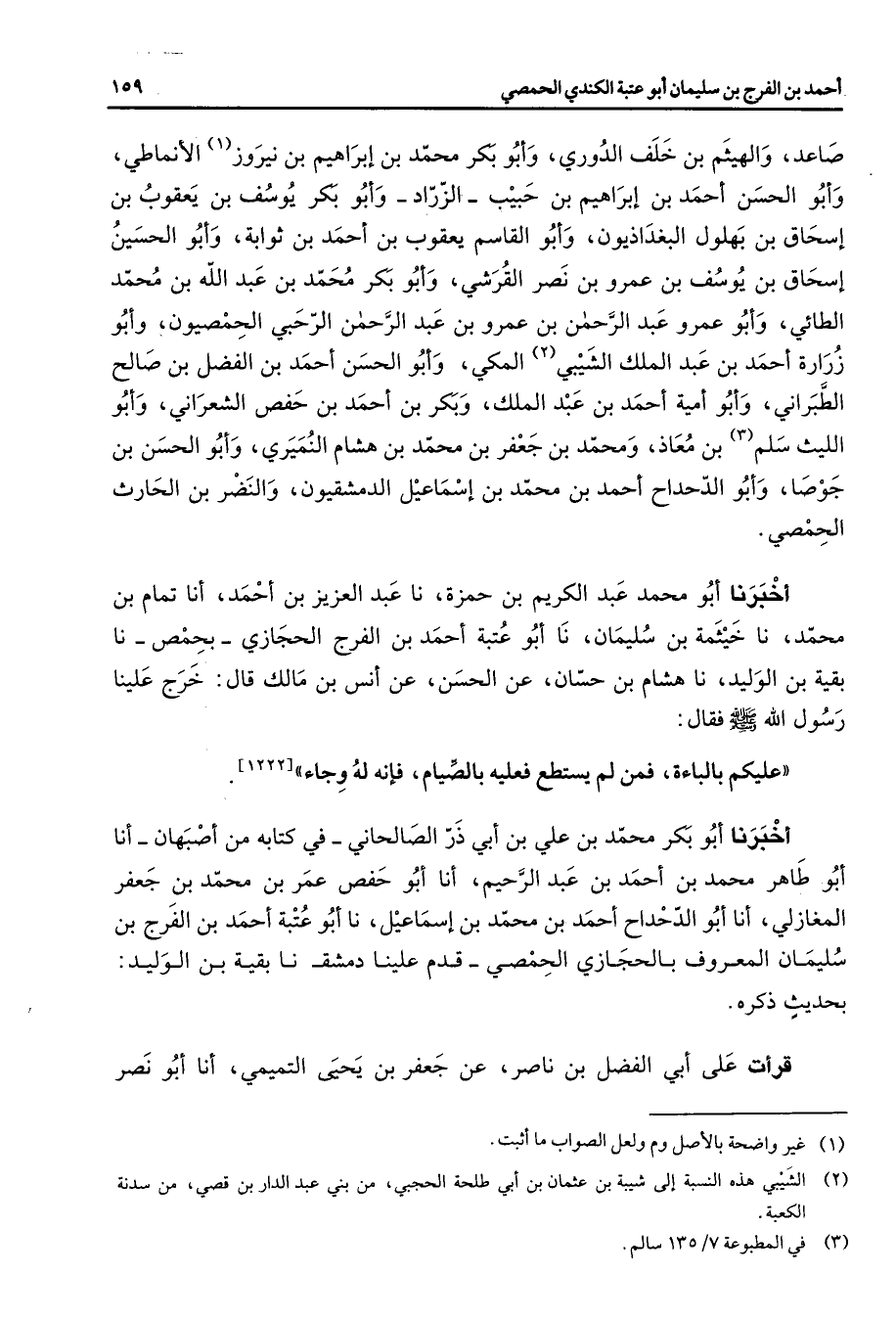 صاعد والهيثم بن خلف الدوري وأبو بكر محمد بن إبراهيم بن نيروز (1) الأنماطي وأبو الحسن أحمد بن إبراهيم بن حبيب الزراد وأبو بكر يوسف بن يعقوب بن إسحاق بن بهلول البغداديون وأبو القاسم يعقوب بن أحمد بن ثوابة وأبو الحسين إسحاق بن يوسف بن عمرو بن نصر القرشي وأبو بكر محمد بن عبد الله بن محمد الطائي وأبو عمرو عبد الرحمن بن عمرو بن عبد الرحمن الرحبي الحمصيون وأبو زرارة أحمد بن عبد الملك الشيبي (2) المكي وأبو الحسن أحمد بن الفضل بن صالح الطبراني وأبو أمية أحمد بن عبد الملك وبكر بن أحمد بن حفص الشعراني وأبو الليث سلم (3) بن معاذ ومحمد بن جعفر بن محمد بن هشام النميري وأبو الحسن بن جوصا وأبو الدحداح أحمد بن محمد بن إسماعيل الدمشقيون والنضر بن الحارث الحمصي أخبرنا أبو محمد عبد الكريم بن حمزة نا عبد العزيز بن أحمد أنا تمام بن محمد نا خيثمة بن سليمان نا أبو عتبة أحمد بن الفرج الحجازي بحمص نا بقية بن الوليد نا هشام بن حسان عن الحسن عن أنس بن مالك قال خرج علينا رسول الله (صلى الله عليه وسلم) فقال عليكم بالباءة فمن لم يستطع فعليه بالصيام فإنه له وجاء أخبرنا أبو بكر محمد بن علي بن أبي ذر الصالحاني في كتابه من أصبهان أنا أبو طاهر محمد بن أحمد بن عبد الرحيم أنا أبو حفص عمر بن محمد بن جعفر المغازلي أنا أبو الدحداح أحمد بن محمد بن إسماعيل نا أبو عتبة أحمد بن الفرج بن سليمان المعروف بالحجازي الحمصي قدم علينا دمشق نا بقية بن الوليد بحديث ذكره قرأت على أبي الفضل بن ناصر عن جعفر بن يحيى التميمي أنا أبو نصر