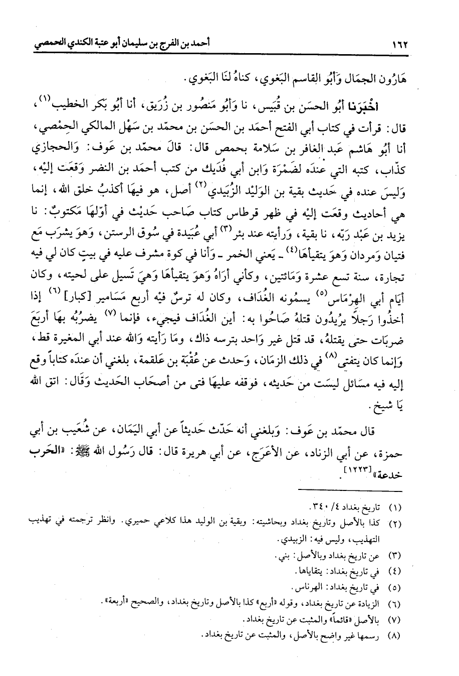 هارون الجمال وأبو القاسم البغوي كناه لنا البغوي أخبرنا أبو الحسن بن قبيس نا وأبو منصور بن زريق أنا أبو بكر الخطيب (1) قال قرأت في كتاب أبي الفتح أحمد بن الحسن بن محمد بن سهل المالكي الحمصي أنا أبو هاشم عبد الغافر بن سلامة بحمص قال قال محمد بن عوف والحجازي كذاب كتبه التي عنده لضمرة وابن أبي فديك من كتب أحمد بن النضر وقعت إليه وليس عنده في حديث بقية بن الوليد الزبيدي (2) أصل هو فيها أكذب خلق الله إنما هي أحاديث وقعت إليه في ظهر قرطاس كتاب صاحب حديث في أولها مكتوب نا يزيد بن عبد ربه نا بقية ورأيته عند بئر (3) أبي عبيدة في سوق الرستن وهو يشرب مع فتيان ومردان وهو يتقيأها (4) يعني الخمر وأنا في كوة مشرف عليه في بيت كان لي فيه تجارة سنة تسع عشرة ومائتين وكأني أراه وهو يتقيأها وهي تسيل على لحيته وكان أيام أبي الهرماس (5) يسمونه الغداف وكان له ترس فيه أربع مسامير كبار (6) إذا أخذوا رجلا يريدون قتله صاحوا به أين الغداف فيجئ فإنما (7) يضربه بها أربع ضربات حتى يقتله قد قتل غير واحد بترسه ذاك وما رأيته والله عند أبي المغيرة قط وإنما كان يتفتى (8) في ذلك الزمان وحدث عن عقبة بن علقمة بلغني أن عنده كتابا وقع إليه فيه مسائل ليست من حديثه فوقفه عليها فتى من أصحاب الحديث وقال اتق الله يا شيخ قال محمد بن عوف وبلغني أنه حدث حديثا عن أبي اليمان عن شعيب بن أبي حمزة عن أبي الزناد عن الأعرج عن أبي هريرة قال قال رسول الله (صلى الله عليه وسلم) الحرب خدعة