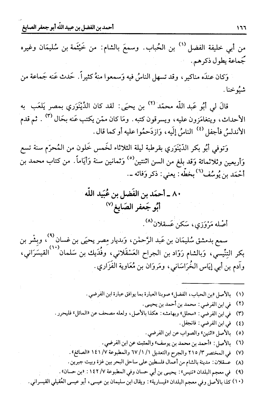 80 - أحمد بن الفضل بن عبيد الله أبو جعفر الصايغ (7) أصله مروزي سكن عسقلان (8) سمع بدمشق سليمان بن عبد الرحمن وبديار مصر يحيى بن غسان (9) وبشر بن التنيسي وبالشام رواد بن الجراح العسقلاني وفديك بن سلمان (10) القيسراني وآدم بن أبي إياس الخراساني ومروان بن معاوية الفزاري
