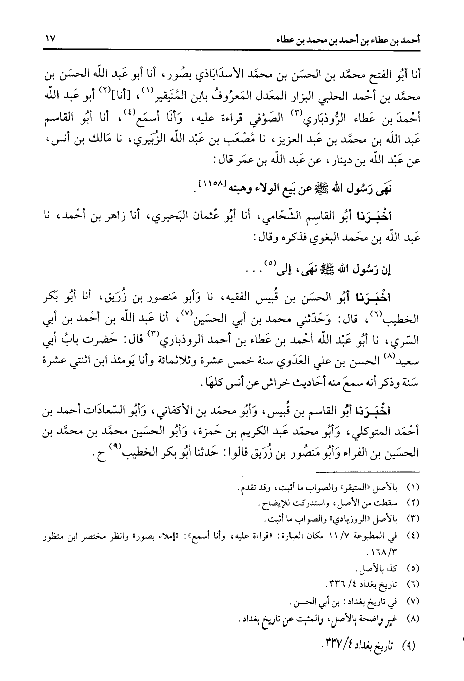 أنا أبو الفتح محمد بن الحسن بن محمد الأسداباذي بصور أنا أبو عبد الله الحسن بن محمد بن أحمد الحلبي البزار المعدل المعروف بابن المنيقير (1) [أنا] (2) أبو عبد الله أحمد بن عطاء الروذباري (3) الصوفي قراءة عليه وأنا أسمع (4) أنا أبو القاسم عبد الله بن محمد بن عبد العزيز نا مصعب بن عبد الله الزبيري نا مالك بن أنس عن عبد الله بن دينار عن عبد الله بن عمر قال نهى رسول الله (صلى الله عليه وسلم) عن بيع الولاء وهبته