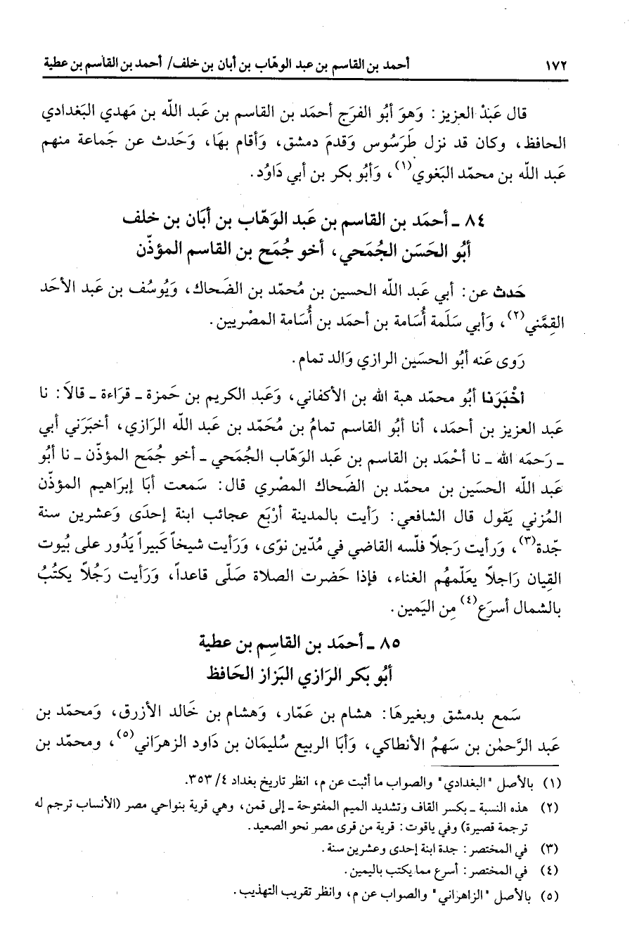 85 - أحمد بن القاسم بن عطية أبو بكر الرازي البزاز الحافظ سمع بدمشق وبغيرها هشام بن عمار وهشام بن خالد الأزرق ومحمد بن عبد الرحمن بن سهم الأنطاكي وأبا الربيع سليمان بن داود الزهراني (5) ومحمد بن