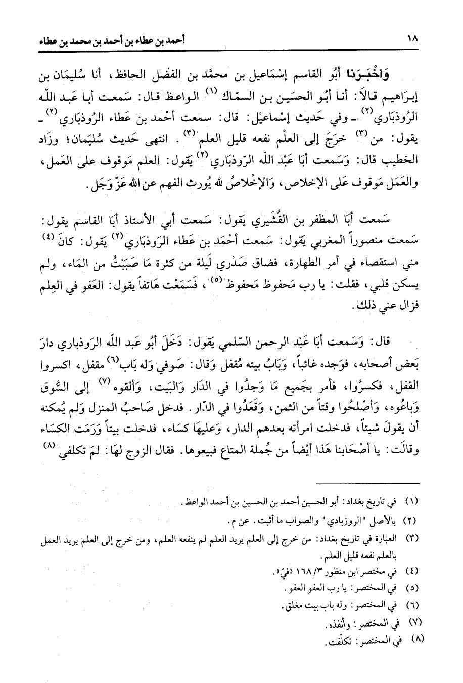 وأخبرنا أبو القاسم إسماعيل بن محمد بن الفضل الحافظ أنا سليمان بن إبراهيم قالا أنا أبو الحسين بن السماك (1) الواعظ قال سمعت أبا عبد الله الروذباري (2) وفي حديث إسماعيل قال سمعت أحمد بن عطاء الروذباري يقول من (3) خرج إلى العلم نفعه قليل العلم (3) انتهى حديث سليمان وزاد الخطيب قال وسمعت أبا عبد الله الروذباري (2) يقول العلم موقوف على العمل والعمل موقوف على الإخلاص والإخلاص لله يورث الفهم عن الله عز وجل سمعت أبا المظفر بن القشيري يقول سمعت أبي الأستاذ أبا القاسم يقول سمعت منصورا المغربي يقول سمعت أحمد بن عطاء الروذباري (3) يقول كان (4) مني استقصاء في أمر الطهارة فضاق صدري ليلة من كثرة ما صببت من الماء ولم يسكن قلبي فقلت يا رب محفوظ محفوظ (5) فسمعت هاتفا يقول العفو في العلم فزال عني ذلك قال وسمعت أبا عبد الرحمن السلمي يقول دخل أبو عبد الله الروذباري دار بعض أصحابه فوجده غائبا وباب بيته مقفل وقال صوفي وله باب (6) مقفل اكسروا القفل فكسروا فأمر بجميع ما وجدوا في الدار والبيت وألقوه (7) إلى السوق وباعوه وأصلحوا وقتا من الثمن وقعدوا في الدار فدخل صاحب المنزل ولم يمكنه أن يقول شيئا فدخلت امرأته بعدهم الدار وعليها كساء فدخلت بيتا ورمت الكساء وقالت يا أصحابنا هذا أيضا من جملة المتاع فبيعوها فقال الزوج لها لم تكلفي (8)