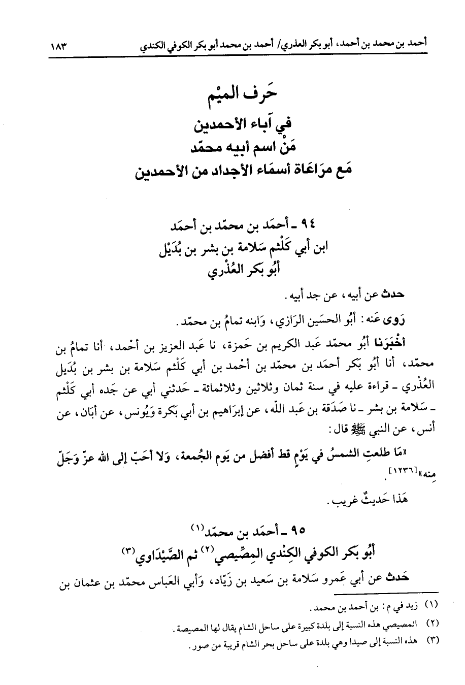 95 - أحمد بن محمد (1) أبو بكر الكوفي الكندي المصيصي (2) ثم الصيداوي (3) حدث عن أبي عمرو سلامة بن سعيد بن زياد وأبي العباس محمد بن عثمان بن