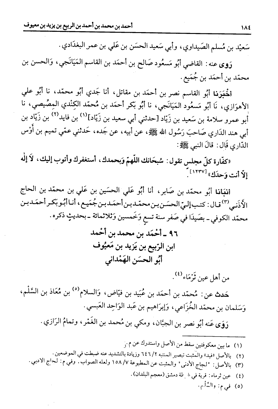 96 - أحمد بن محمد بن أحمد ابن الربيع بن يزيد بن معيوف أبو الحسن الهمداني من أهل عين ثرماء (4) حدث عن محمد بن أحمد بن عبيد بن فياض والسلام (5) بن معاذ بن السلم وسلمان بن محمد الخزاعي وإبراهيم بن عبد الواحد العبسي روى عنه أبو نصر بن الجبان ومكي بن محمد بن الغمر وتمام الرازي
