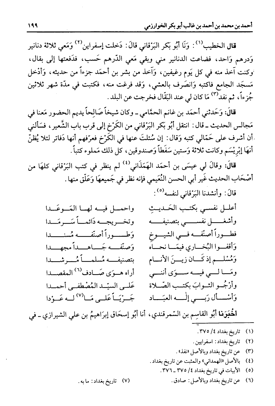 قال الخطيب (1) ونا أبو بكر البرقاني قال دخلت إسفراين (2) ومعي ثلاثة دنانير ودرهم واحد فضاعت الدنانير مني وبقي معي الدرهم حسب فدفعتها إلى بقال وكنت آخذ منه في كل يوم رغيفين وآخذ من بشر بن أحمد جزءا من حديثه وأدخل مسجد الجامع فاكتبه وانصرف بالعشي وقد فرغت منه فكتبت في مدة شهر ثلاثين جزءا ثم نفد (3) ما كان لي عند البقال فخرجت عن البلد قال وحدثني أحمد بن غانم الحمامي وكان شيخا صالحا يديم الحضور معنا في مجالس الحديث قال انتقل أبو بكر البرقاني من الكرخ إلى قرب باب الشعير فسألني أن أشرف على حمالي كتبه وقال إن سئلت عنها في الكرخ فعرفهم أنها دفاتر لئلا يظن أنها إبريسم وكانت ثلاثة وستين سفطا وصندوقين كل ذلك مملوء كتبا قال وقال لي عيسى بن أحمد الهمذاني (4) لم ينظر في كتب البرقاني كلها من أصحاب الحديث غير أبي الحسن النعيمي فإنه نظر في جميعها وعلق منها قال وأنشدنا البرقاني لنفسه (5) * أعلل نفسي بكتب الحديث * واحمل في هـ لها الموعدا وأشغل نفسي بتصنيفه * وتخريجه دائما سرمدا فطورا أصنفه في الشيوخ * وطورا أصنفه مسندا وأقفوا البخاري فيما نحاه * وصنفه جاهدا مجهدا ومسلم إذ كان زين الأنام * بتصنيفه مسلما مرشدا وما لي فيه سوى أنني * أراه هوى صادف (6) المقصدا وأرجو الثواب بكتب الصلاة * على السيد المصطفى أحمدا وأسأل ربي إله العباد * جريا على ما (7) له عودا * أخبرنا أبو القاسم بن السمرقندي أنا أبو إسحاق إبراهيم بن علي الشيرازي في