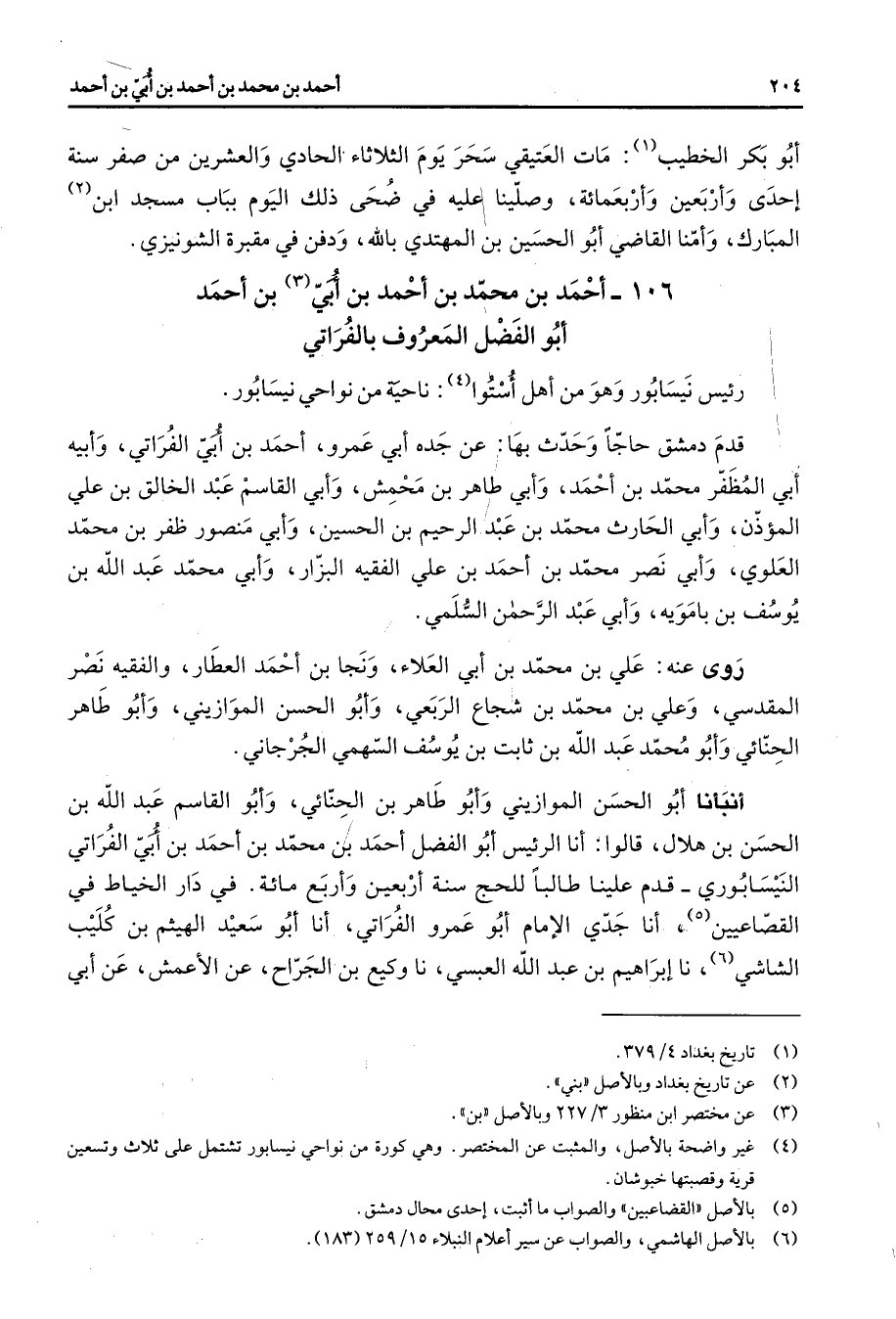 106 - أحمد بن محمد بن أحمد بن أبي (3) بن أحمد أبو الفضل المعروف بالفراتي رئيس نيسابور وهو من أهل أستوا (4) ناحية من نواحي نيسابور قدم دمشق حاجا وحدث بها عن جده أبي عمرو أحمد بن أبي الفراتي وأبيه أبي المظفر محمد بن أحمد وأبي طاهر بن محمش وأبي القاسم عبد الخالق بن علي المؤذن وأبي الحارث محمد بن عبد الرحيم بن الحسين وأبي منصور ظفر بن محمد العلوي وأبي نصر محمد بن أحمد بن علي الفقيه البزار وأبي محمد عبد الله بن يوسف بن بامويه وأبي عبد الرحمن السلمي روى عنه علي بن محمد بن أبي العلاء ونجا بن أحمد العطار والفقيه نصر المقدسي وعلي بن محمد بن شجاع الربعي وأبو الحسن الموازيني وأبو طاهر الحنائي وأبو محمد عبد الله بن ثابت بن يوسف السهمي الجرجاني أنبأنا أبو الحسن الموازيني وأبو طاهر بن الحنائي وأبو القاسم عبد الله بن الحسن بن هلال قالوا أنا الرئيس أبو الفضل أحمد بن محمد بن أحمد بن أبي الفراتي النيسابوري قدم علينا طالبا للحج سنة أربعين وأربع مائة في دار الخياط في القصاعيين (5) أنا جدي الإمام أبو عمرو الفراتي أنا أبو سعيد الهيثم بن كليب الشاشي (6) نا إبراهيم بن عبد الله العبسي نا وكيع بن الجراح عن الأعمش عن أبي