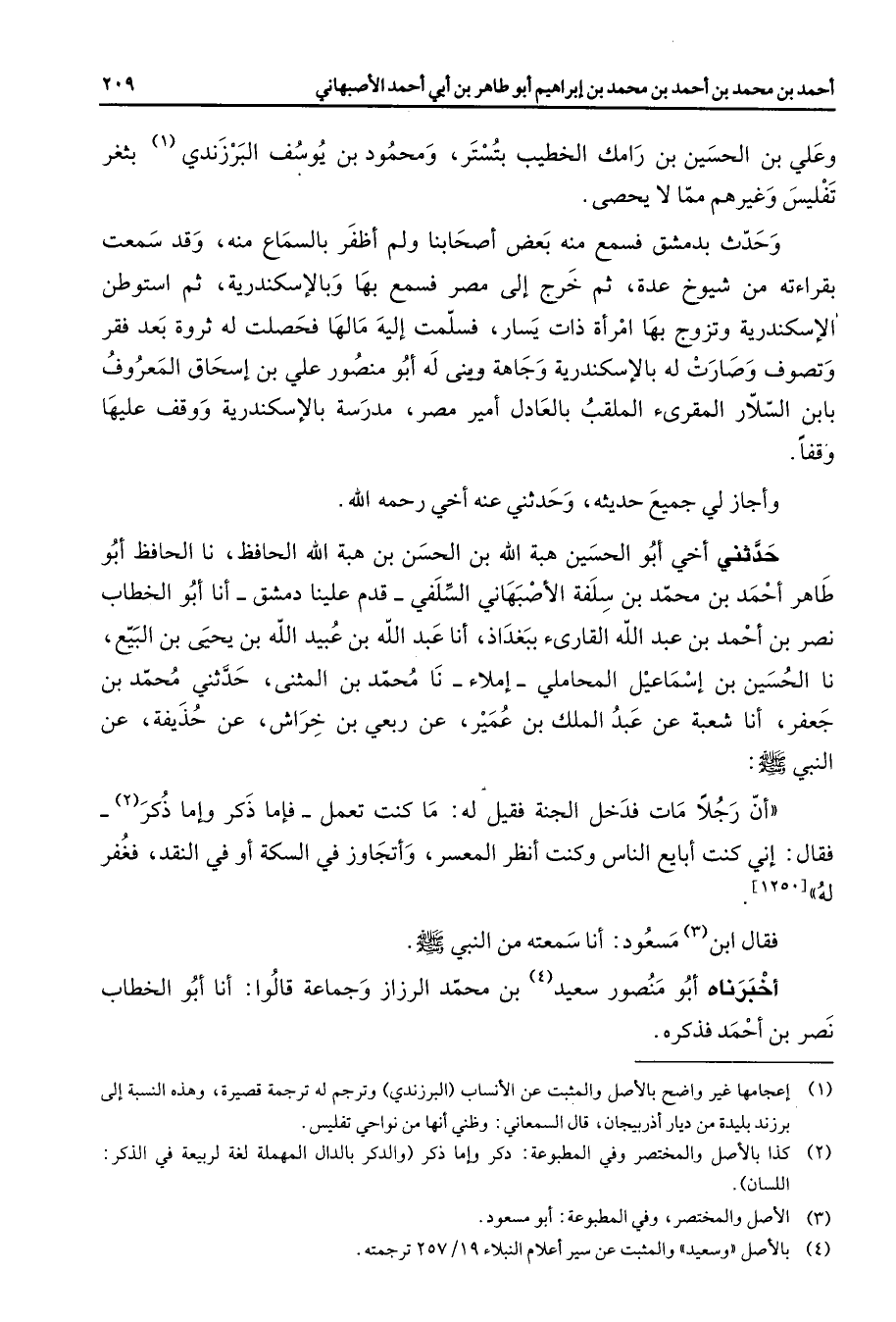 وعلي بن الحسين بن رامك الخطيب بتستر ومحمود بن يوسف البرزندي (1) بثغر تفليس وغيرهم مما لا يحصى وحدث بدمشق فسمع منه بعض أصحابنا ولم أظفر بالسماع منه وقد سمعت بقراءاته من شيوخ عدة ثم خرج إلى مصر فسمع بها وبالإسكندرية ثم استوطن الإسكندرية وتزوج بها امرأة ذات يسار فسلمت إليه مالها فحصلت له على ثروة بعد فقر وتصوف وصارت له بالإسكندرية وجاهة وبنى له أبو منصور علي بن إسحاق المعروف بابن السلار المقرئ الملقب بالعادل أمير مصر مدرسة بالإسكندرية ووقف عليها وقفا وأجاز لي جميع حديثه وحدثني عنه أخي رحمه الله حدثني أخي أبو الحسين هبة الله بن الحسن بن هبة الله الحافظ نا الحافظ أبو طاهر أحمد بن محمد بن سلفة الأصبهاني السلفي قدم علينا دمشق أنا أبو الخطاب نصر بن أحمد بن عبد الله القارئ ببغداذ أنا عبد الله بن عبيد الله بن يحيى بن البيع نا الحسين بن إسماعيل المحاملي إملاء نا محمد بن المثنى حدثني محمد بن جعفر أنا شعبة عن عبد الملك بن عمير عن ربعي بن خراش عن حذيفة عن النبي (صلى الله عليه وسلم) أن رجلا مات فدخل الجنة فقيل له ما كنت تعمل فإما ذكر وإما ذكر (2) فقال إني كنت أبايع الناس وكنت أنظر المعسر وأتجاوز في السكة أو في النقد فغفر له فقال ابن (3) مسعود أنا سمعته من النبي (صلى الله عليه وسلم) أخبرناه أبو منصور سعيد (4) بن محمد الرزاز وجماعة قالوا أنا أبو الخطاب نصر بن أحمد فذكره