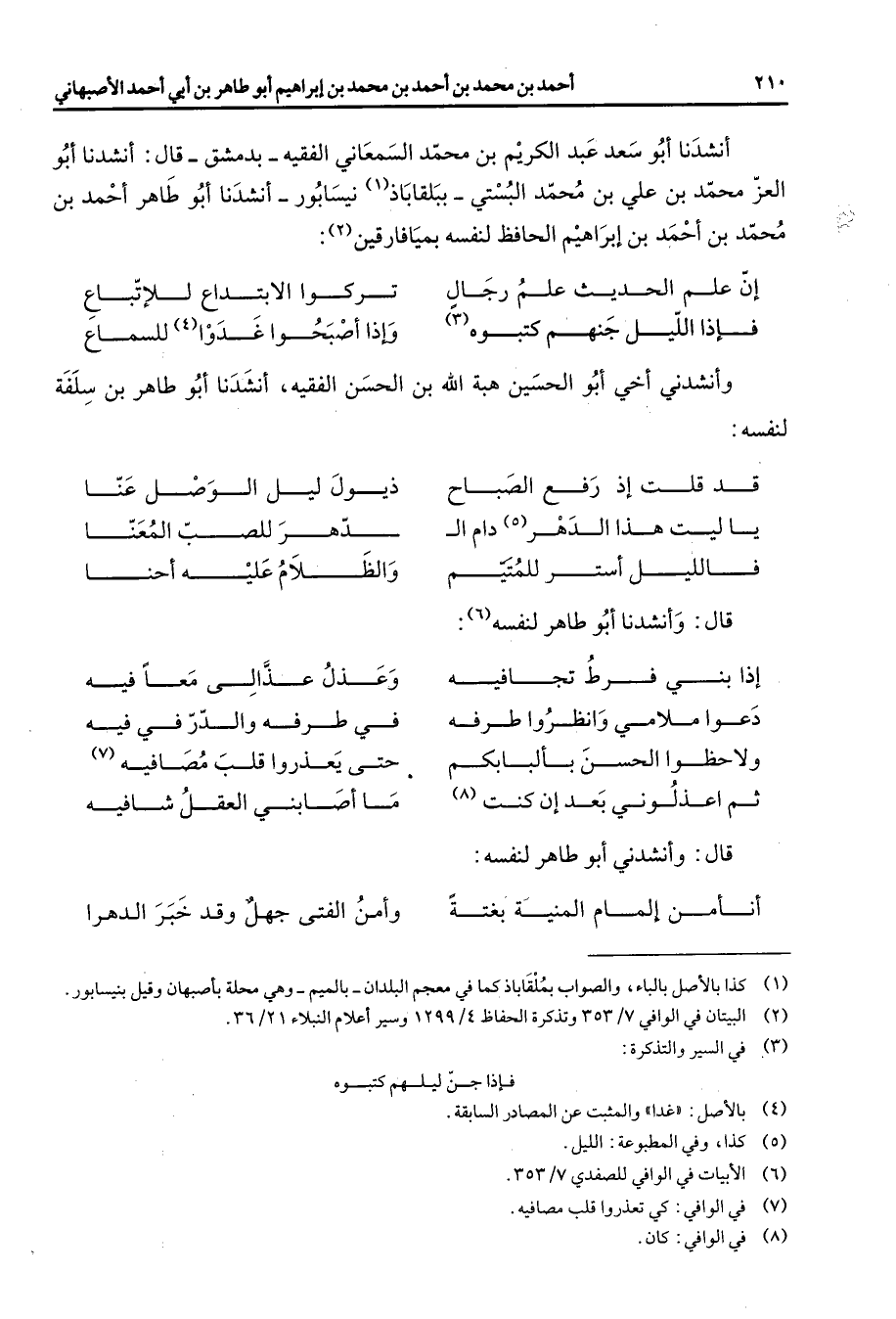أنشدنا أبو سعد عبد الكريم بن محمد السمعاني الفقيه بدمشق قال أنشدنا أبو العز محمد بن علي بن محمد البستي ببلقاباذ (1) نيسابور أنشدنا أبو طاهر أحمد بن محمد بن أحمد بن إبراهيم الحافظ لنفسه بميافارقين (2) * إن علم الحديث علم رجال * تركوا الابتداع للإتباع فإذا الليل جنهم كتبوه (3) * وإذا أصبحوا غدوا (4) للسماع * وأنشدني أخي أبو الحسين هبة الله بن الحسن الفقيه أنشدنا أبو طاهر بن سلفة لنفسه * قد قلت إذ رفع الصباح * ذيول ليل الوصل عنا يا ليت هذا الدهر (5) دام ال * دهر للصب المعنا فالليل أستر للمتيم * والظلام عليه أحنا * قال وأنشدنا أبو طاهر لنفسه (6) * إذا بني فرط تجافيه * وعذل عذالي معا فيه دعوا ملامي وانظروا طرفه * في طرفه والدر في فيه ولاحظوا الحسن بألبابكم * حتى يعذروا قلب مصافيه (7) ثم اعذلوني بعد إن كنت (8) * ما أصابني العقل شافيه * قال وأنشدني أبو طاهر لنفسه * أنأمن إلمام المنية بغتة * وأمن الفتى جهل وقد خبر الدهرا