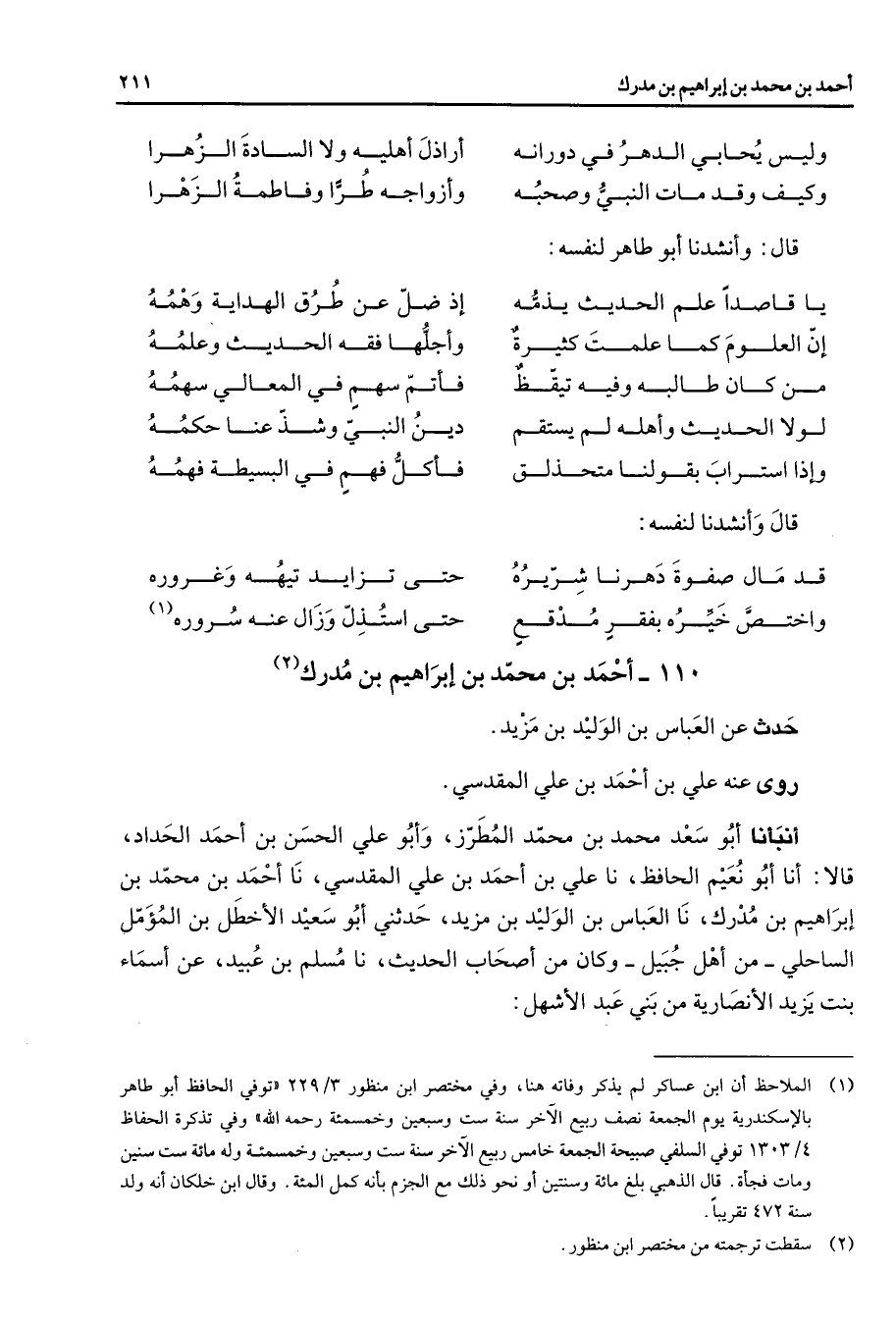 وليس يحابي الدهر في دورانه * أراذل أهليه ولا السادة الزهرا وكيف وقد مات النبي وصحبه * وأزواجه طرا وفاطمة الزهرا * قال وأنشدنا أبو طاهر لنفسه * يا قاصدا علم الحديث يذمه * إذ ضل عن طرق الهداية وهمه إن العلوم كما علمت كثيرة * وأجلها فقه الحديث وعلمه من كان طالبه وفيه تيقظ * فأتم سهم في المعالي سهمه * * لولا الحديث وأهله لم يستقم * دين النبي وشذ عنا حكمه وإذا استراب بقولنا متحذلق * فأكل فهم في البسيطة فهمه * قال وأنشدنا لنفسه * قد مال صفوة دهرنا شريره * حتى تزايد تيهه وغروره واختص خيره بفقر مدقع * حتى استذل وزال عنه سروره * (1)
