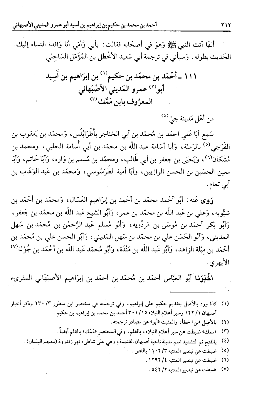 111 - أحمد بن محمد بن حكيم (1) بن إبراهيم بن أسيد أبو (2) عمرو المديني الأصبهاني المعروف بابن ممك (3) من أهل مدينة جي (4) سمع أبا علي أحمد بن محمد بن أبي الخناجر بأطرابلس ومحمد بن يعقوب بن الفرجي (5) بالرملة وأبا أسامة عبد الله بن محمد بن أبي أسامة الحلبي ومحمد بن مشكان (6) ويحيى بن جعفر بن أبي طالب ومحمد بن مسلم بن واره وأبا حاتم وأبا معين الحسين بن الحسن الرازيين وأبا أمية الطرسوسي ومحمد بن عبد الوهاب بن أبي تمام روى عنه أبو أحمد محمد بن أحمد بن إبراهيم العسال ومحمد بن أحمد بن شبويه وعلي بن عبد الله بن محمد بن عمر وأبو الشيخ عبد الله بن محمد بن جعفر وأبو بكر أحمد بن موسى بن مردويه وأبو مسلم عبد الرحمن بن محمد بن سهل المديني وأبو الحسن علي بن محمد بن سهل المديني وأبو الحسن علي بن محمد بن أحمد بن ميلة الزاهد وأبو عبد الله بن منده وأبو محمد عبد الله بن أحمد بن جولة (7) الأبهري أخبرنا أبو العباس أحمد بن محمد بن أحمد بن إبراهيم الأصبهاني المقرئ