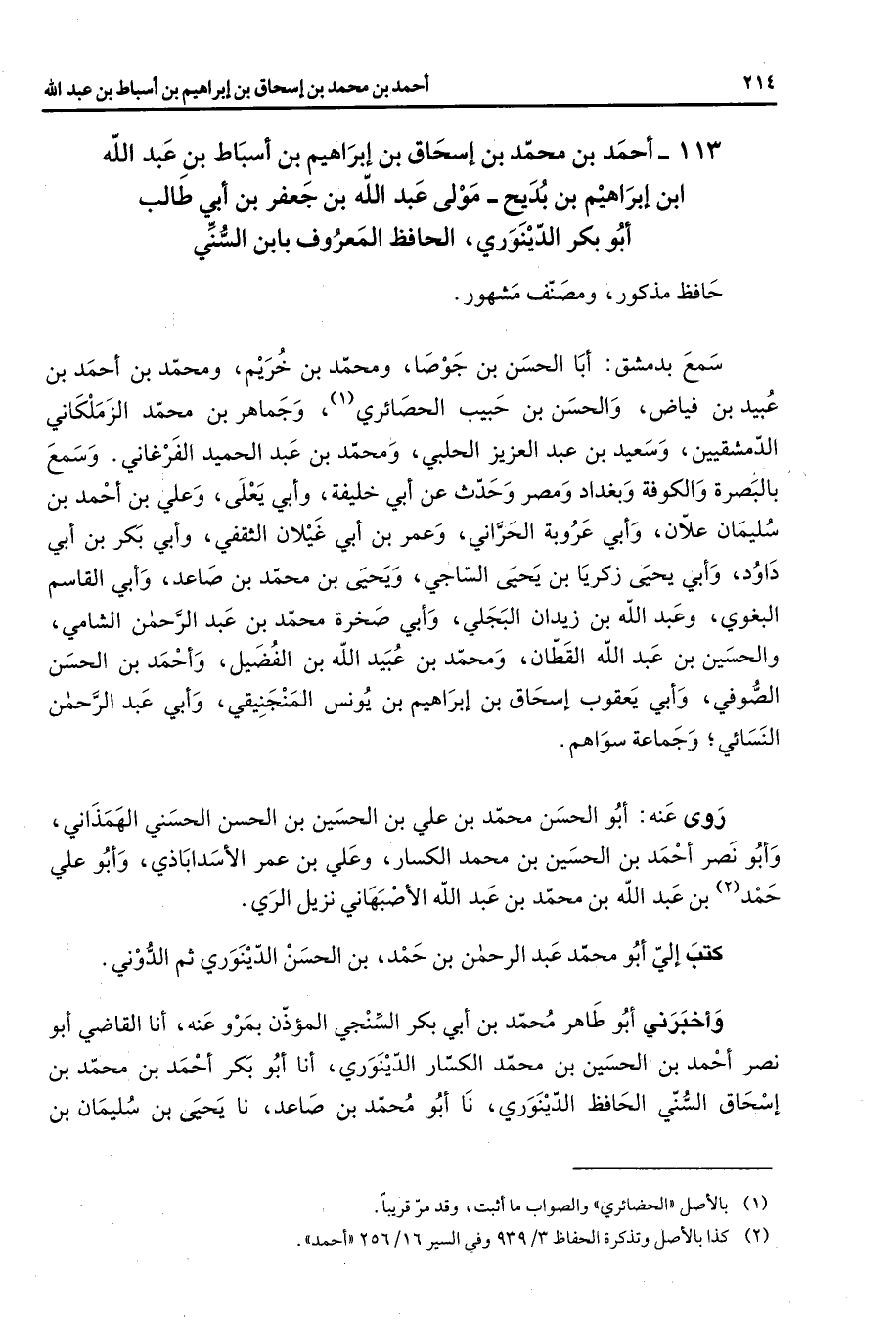 113 - أحمد بن محمد بن إسحاق بن إبراهيم بن أسباط بن عبد الله ابن إبراهيم بن بديح مولى عبد الله بن جعفر بن أبي طالب أبو بكر الدينوري الحافظ المعروف بابن السني حافظ مذكور ومصنف مشهور سمع بدمشق أبا الحسن بن جوصا ومحمد بن خريم ومحمد بن أحمد بن عبيد بن فياض والحسن بن حبيب الحصائري (1) وجماهر بن محمد الزملكاني الدمشقيين وسعيد بن عبد العزيز الحلبي ومحمد بن عبد الحميد الفرغاني وسمع بالبصرة والكوفة وبغداد ومصر وحدث عن أبي خليفة وأبي يعلى وعلي بن أحمد بن سليمان علان وأبي عروبة الحراني وعمر بن أبي غيلان الثقفي وأبي بكر بن أبي داود وأبي يحيى زكريا بن يحيى الساجي ويحيى بن محمد بن صاعد وأبي القاسم البغوي وعبد الله بن زيدان البجلي وأبي صخرة محمد بن عبد الرحمن الشامي والحسين بن عبد الله القطان ومحمد بن عبيد الله بن الفضيل وأحمد بن الحسن الصوفي وأبي يعقوب إسحاق بن إبراهيم بن يونس المنجنيقي وأبي عبد الرحمن النسائي وجماعة سواهم روى عنه أبو الحسن محمد بن علي بن الحسين بن الحسن الحسني الهمذاني وأبو نصر أحمد بن الحسين بن محمد الكسار وعلي بن عمر الأسداباذي وأبو علي حمد (2) بن عبد الله بن محمد بن عبد الله الأصبهاني نزيل الري كتب إلى أبو محمد عبد الرحمن بن حمد بن الحسن الدينوري ثم الدوني وأخبرني أبو طاهر محمد بن أبي بكر السنجي المؤذن بمرو عنه أنا القاضي أبو نصر أحمد بن الحسين بن محمد الكسار الدينوري أنا أبو بكر أحمد بن محمد بن إسحاق السني الحافظ الدينوري نا أبو محمد بن صاعد نا يحيى بن سليمان بن