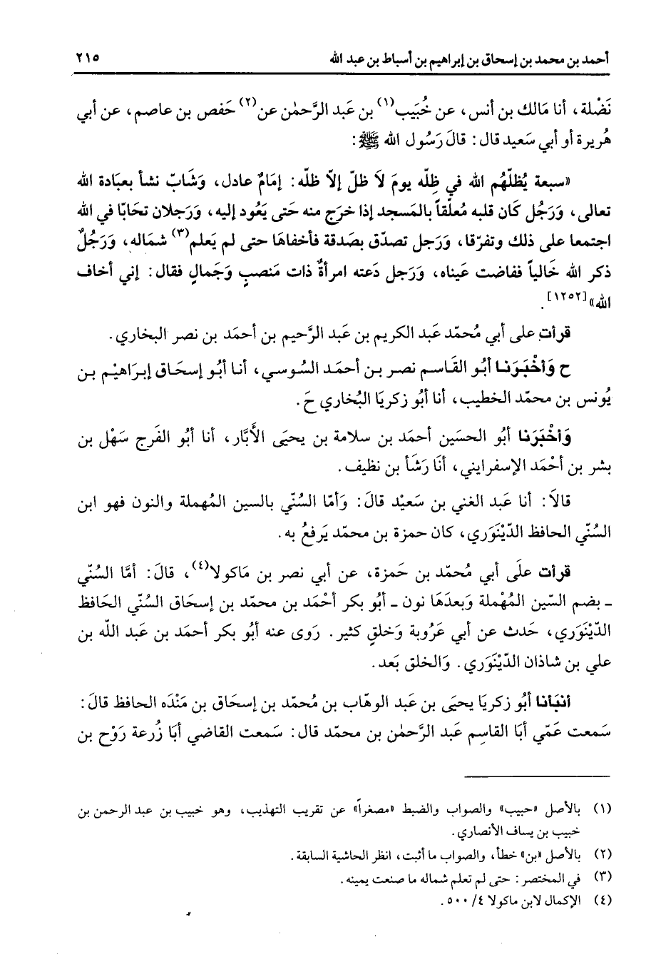 نضلة أنا مالك بن أنس عن خبيب (1) بن عبد الرحمن عن (2) حفص بن عاصم عن أبي هريرة أو أبي سعيد قال قال رسول الله (صلى الله عليه وسلم) سبعة يظلهم الله في ظله يوم لا ظل إلا ظله إمام عادل وشاب نشأ بعبادة الله تعالى ورجل كان قلبه معلقا بالمسجد إذا خرج منه حتى يعود إليه ورجلان تحابا في الله اجتمعا على ذلك وتفرقا ورجل تصدق بصدقة فأخفاها حتى لم يعلم (3) شماله ورجل ذكر الله خاليا ففاضت عيناه ورجل دعته امرأة ذات منصب وجمال فقال إني أخاف الله قرأت على أبي محمد عبد الكريم بن عبد الرحيم بن أحمد بن نصر البخاري ح وأخبرنا أبو القاسم نصر بن أحمد السوسي أنا أبو إسحاق إبراهيم بن يونس بن محمد الخطيب أنا أبو زكريا البخاري وأخبرنا أبو الحسين أحمد بن سلامة بن يحيى الأبار أنا أبو الفرج سهل بن بشر بن أحمد الإسفرايني أنا رشأ بن نظيف قالا أنا عبد الغني بن سعيد قال وأما السني بالسين المهملة والنون فهو ابن السني الحافظ الدينوري كان حمزة بن محمد يرفع به قرأت على أبي محمد بن حمزة عن أبي نصر بن ماكولا (4) قال أما السني بضم السين المهملة وبعدها نون أبو بكر أحمد بن محمد بن إسحاق السني الحافظ الدينوري حدث عن أبي عروبة وخلق كثير روى عنه أبو بكر أحمد بن عبد الله بن علي بن شاذان الدينوري والخلق بعد أنبأنا أبو زكريا يحيى بن عبد الوهاب بن محمد بن إسحاق بن منده الحافظ قال سمعت عمي أبا القاسم عبد الرحمن بن محمد قال سمعت القاضي أبا زرعة روح بن
