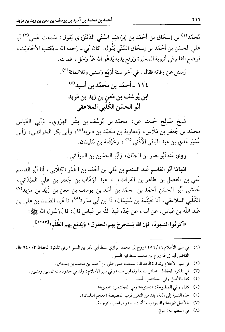 114 - أحمد بن محمد بن أسيد (4) ابن يوسف بن معن بن زيد بن مزيد أبو الحسن الكلبي الملاعقي شيخ صالح حدث عن محمد بن يوسف بن بشر الهروي وأبي العباس محمد بن جعفر بن ملاس ومعاوية بن محمد بن دنويه (5) وأبي بكر الخرائطي وأبي عمير عدي بن عبد الباقي الأذني (6) وخيثمة بن سليمان روى عنه أبو نصر بن الجبان وأبو الحسين بن الميداني أنبأنا أبو القاسم عبد المنعم بن علي بن أحمد بن الغمر الكلابي أنا أبو القاسم علي بن الفضل بن طاهر بن الفرات نا عبد الوهاب بن جعفر بن علي الميداني حدثني أبو الحسن أحمد بن محمد بن أسد بن يوسف بن معن بن زيد بن مزيد (7) الكلبي الملاعقي أنا خيثمة بن سليمان نا ابن أبي مسرة (8) نا عبد الصمد بن علي بن عبد الله بن عباس عن أبيه عن جده عبد الله بن عباس قال قال رسول الله (صلى الله عليه وسلم) أكرموا الشهود فإن الله يستخرج بهم الحقوق ويدفع بهم الظلم