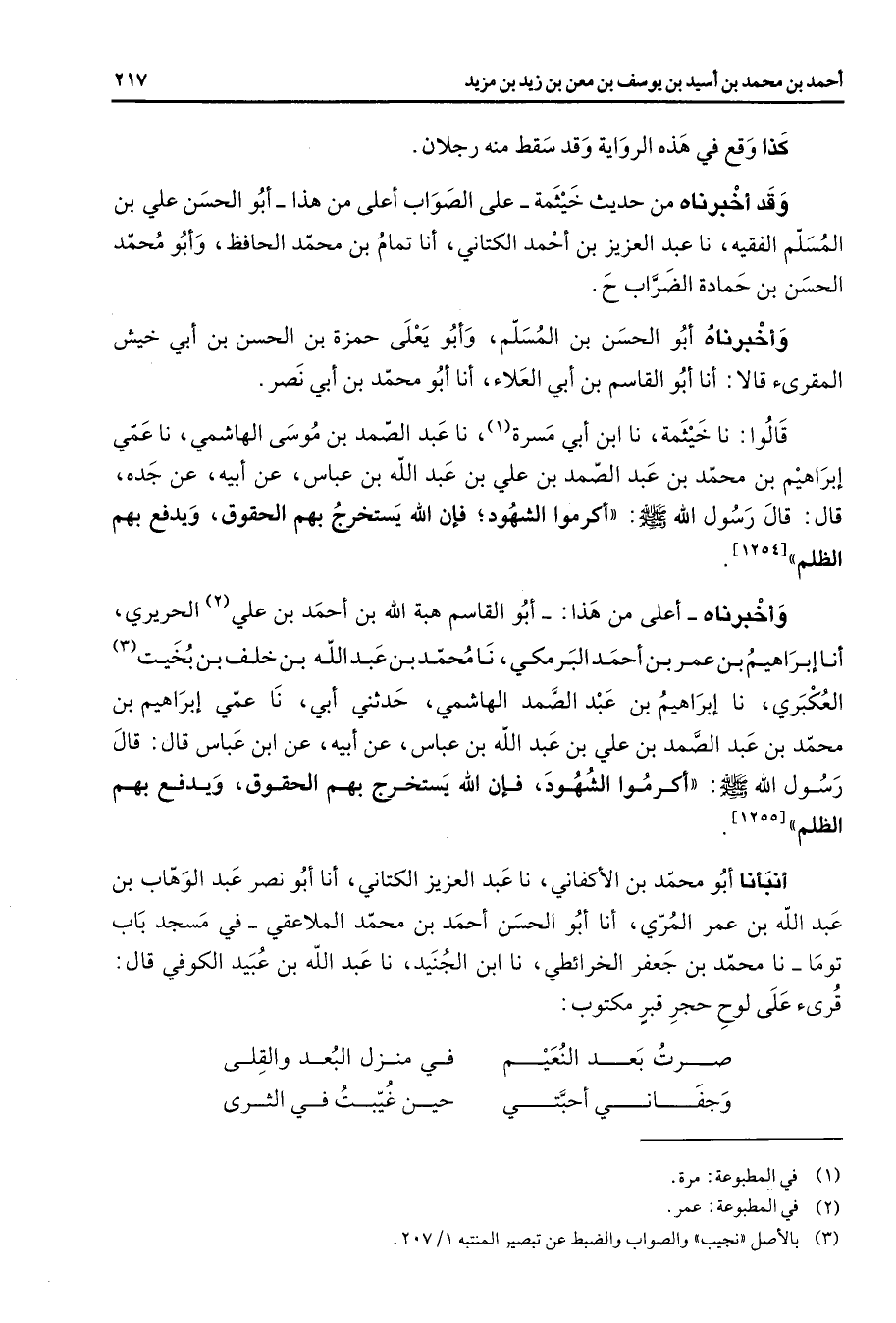 كذا وقع في هذه الرواية وقد سقط منه رجلان وقد أخبرناه من حديث خيثمة على الصواب أعلى من هذا أبو الحسن علي بن المسلم الفقيه نا عبد العزيز بن أحمد الكتاني أنا تمام بن محمد الحافظ وأبو محمد الحسن بن حمادة الضراب وأخبرناه أبو الحسن بن المسلم وأبو يعلى حمزة بن الحسن بن أبي خيش المقرئ قالا أنا أبو القاسم بن أبي العلاء أنا أبو محمد بن أبي نصر قالوا نا خيثمة نا ابن أبي مسرة (1) نا عبد الصمد بن موسى الهاشمي نا عمي إبراهيم بن محمد بن عبد الصمد بن علي بن عبد الله بن عباس عن أبيه عن جده قال قال رسول الله (صلى الله عليه وسلم) أكرموا الشهود فإن الله يستخرج بهم الحقوق ويدفع بهم الظلم وأخبرناه أعلى من هذا أبو القاسم هبة الله بن أحمد بن علي (2) الحريري أنا إبراهيم بن عمر بن أحمد البرمكي نا محمد بن عبد الله بن خلف بن بخيت (3) العكبري نا إبراهيم بن عبد الصمد الهاشمي حدثني أبي نا عمي إبراهيم بن محمد بن عبد الصمد بن علي بن عبد الله بن عباس عن أبيه عن ابن عباس قال قال رسول الله (صلى الله عليه وسلم) أكرموا الشهود فإن الله يستخرج بهم الحقوق ويدفع بهم الظلم أنبأنا أبو محمد بن الأكفاني نا عبد العزيز الكتاني أنا أبو نصر عبد الوهاب بن عبد الله بن عمر المري أنا أبو الحسن أحمد بن محمد الملاعقي في مسجد باب توما نا محمد بن جعفر الخرائطي نا ابن الجنيد نا عبد الله بن عبيد الكوفي قال قرئ على لوح حجر قبر مكتوب * صرت بعد النعيم * في منزل البعد والقلى وجفاني أحبتي * حين غيبت في الثرى