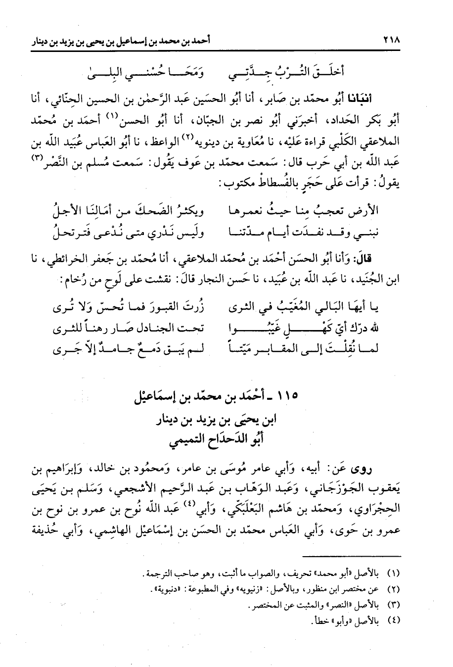 115 - أحمد بن محمد بن إسماعيل ابن يحيى بن يزيد بن دينار أبو الدحداح التميمي روى عن أبيه وأبي عامر موسى بن عامر ومحمود بن خالد وإبراهيم بن يعقوب الجوزجاني وعبد الوهاب بن عبد الرحيم الأشجعي وسلم بن يحيى الحجراوي ومحمد بن هاشم البعلبكي وأبي عبد الله نوح بن عمرو بن نوح بن عمرو بن حوى وأبي العباس محمد بن الحسن بن إسماعيل الهاشمي وأبي حذيفة
