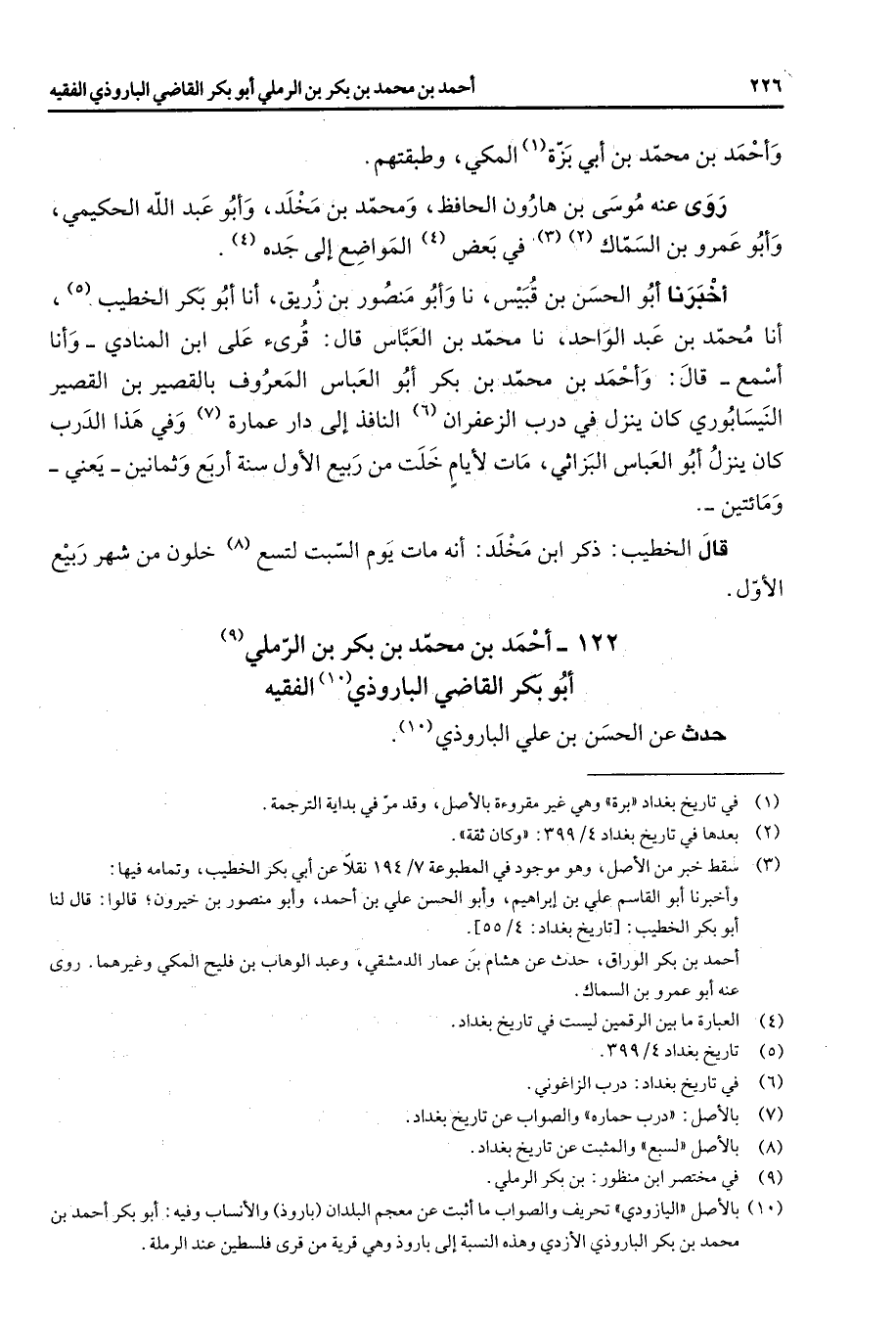 122 - أحمد بن محمد بن بكر بن الرملي (9) أبو بكر القاضي الباروذي (10) الفقيه حدث عن الحسن بن علي الباروذي (10)