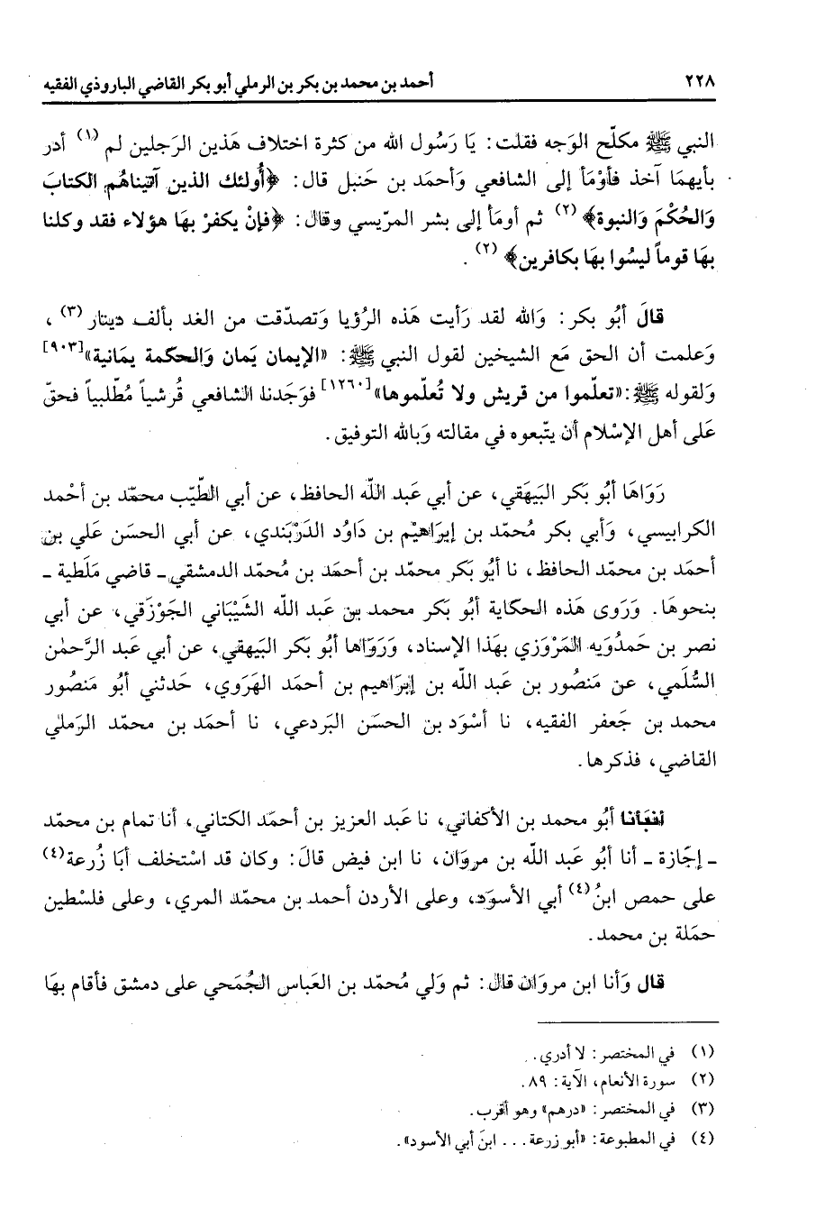 النبي (صلى الله عليه وسلم) مكلح الوجه فقلت يا رسول الله من كثرة اختلاف هذين الرجلين (1) لم أدر بأيهما آخذ فأومأ إلى الشافعي وأحمد بن حنبل قال " أولئك الذين آتيناهم الكتاب والحكم والنبوة " (2) ثم أومأ إلى بشر المريسي وقال " فإن يكفر بها هؤلاء فقد وكلنا بها قوما ليسوا بها بكافرين " (2) قال أبو بكر والله لقد رأيت هذه الرؤيا وتصدقت من الغد بألف دينار (3) وعلمت أن الحق مع الشيخين لقول النبي (صلى الله عليه وسلم) الإيمان يمان والحكمة يمانية ولقوله (صلى الله عليه وسلم) تعلموا من قريش ولا تعلموهاح فوجدنا الشافعي قرشيا مطلبيا فحق على أهل الإسلام أن يتبعوه في مقالته وبالله التوفيق رواها أبو بكر البيهقي عن أبي عبد الله الحافظ عن أبي الطيب محمد بن أحمد الكرابيسي وأبي بكر محمد بن إبراهيم بن داود الدربندي عن أبي الحسن علي بن أحمد بن محمد الحافظ نا أبو بكر محمد بن أحمد بن محمد الدمشقي قاضي ملطية بنحوها وروى هذه الحكاية أبو بكر محمد بن عبد الله الشيباني الجوزقي عن أبي نصر بن حمدويه المروزي بهذا الإسناد ورواها أبو بكر البيهقي عن أبي عبد الرحمن السلمي عن منصور بن عبد الله بن إبراهيم بن أحمد الهروي حدثني أبو منصور محمد بن جعفر الفقيه نا أسود بن الحسن البردعي نا أحمد بن محمد الرملي القاضي فذكرها أنبأنا أبو محمد بن الأكفاني نا عبد العزيز بن أحمد الكتاني أنا تمام بن محمد إجازة أنا أبو عبد الله بن مروان نا ابن فيض قال وكان قد استخلف أبا زرعة (4) على حمص ابن (4) أبي الأسود وعلى الأردن أحمد بن محمد المري وعلى فلسطين حملة بن محمد قال وأنا ابن مروان قال ثم ولي محمد بن العباس الجمحي على دمشق فأقام بها