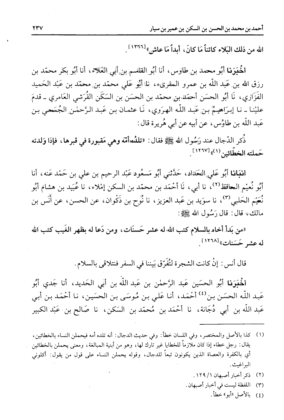 الله من ذلك البلاء كائنا ما كان أبدا ما عاش أخبرنا أبو محمد بن طاوس أنا أبو القاسم بن أبي العلاء أنا أبو بكر محمد بن رزق الله بن عبد الله بن عمرو المقرئ نا أبو علي محمد بن محمد بن عبد الحميد الفزاري نا أبو الحسن أحمد بن محمد بن الحسن بن السكن القرشي العامري قدم علينا نا إبراهيم بن عبد الله الهروي نا عثمان بن عبد الرحمن الجمحي بن عبد الله بن طاوس عن أبيه عن أبي هريرة قال ذكر الدجال عند رسول الله (صلى الله عليه وسلم) فقال تلده أمه وهي مقبورة في قبرها فإذا ولدته حملته الخطائين (1) أنبأنا أبو علي الحداد حدثني أبو مسعود عبد الرحيم بن علي بن حمد عنه أنا أبو نعيم الحافظ (2) نا أبي نا أحمد بن محمد بن السكن إملاء نا عبيد بن هشام أبو نعيم الحلبي (3) نا سويد بن عبد العزيز نا نوح بن ذكوان عن الحسن عن انس بن مالك قال قال رسول الله (صلى الله عليه وسلم) من بدأ أخاه بالسلام كتب الله له عشر حسنات ومن دعا له بظهر الغيب كتب الله له عشر حسناتح قال أنس إن كانت الشجرة لتفرق بيننا في السفر فنتلاقى بالسلام أخبرنا أبو الحسين عبد الرحمن بن عبد الله بن أبي الحديد أنا جدي أبو عبد الله الحسن بن (4) أحمد أنا علي بن موسى بن الحسين نا أحمد بن أبي عبد الله بن أبي دجانة نا أحمد بن محمد بن السكن نا صالح بن عبد الكبير