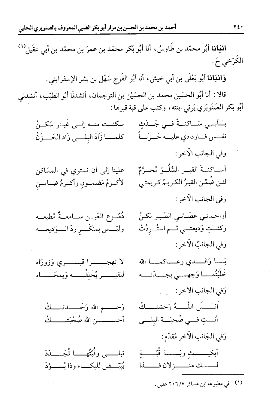 أنبأنا أبو محمد بن طاوس أنا أبو بكر محمد بن عمر بن محمد بن أبي عقيل (1) الكرخي وأنبأنا أبو يعلى بن أبي خيش أنا أبو الفرج سهل بن بشر الإسفرايني قالا أنا أبو الحسين محمد بن الحسين بن الترجمان أنشدنا أبو الطيب أنشدني أبو بكر الصنوبري يرثي ابنته وكتب على قبة قبرها * بأبي ساكنة في جدث * سكنت منه إلى غير سكن نفس فازدادي عليه حزنا * كلما زاد البلى زاد الحزن * وفي الجانب الآخر * أساكنة القبر السلو محرم * علينا إلى أن نستوي في المساكن لئن ضمن القبر الكريم كريمتي * لأكرم مضمون وأكرم ضامن * وفي الجانب الآخر * أو احدتي عصاني الصبر لكن * دموع العين سامعة مطيعة وكنت وديعتي ثم استردت * وليس بمنكر رد الوديعة * وفي الجانب الآخر * يا والدي رعاكما الله * لا تهجرا قبري وزوراه خليتما وجهي بجدته * للقبر يخلقه ويمحاه * وفي الجانب الآخر * آنس الله وحشتك * رحم الله وحدتك أنت في صحبة البلى * أحسن الله صحبتك وفي الجانب الآخر مقدم * أبكيك ربة قبة * تبلى وقبتها تجدد لك منزلان فذا * يبيض للبكاء وذا يسود *
