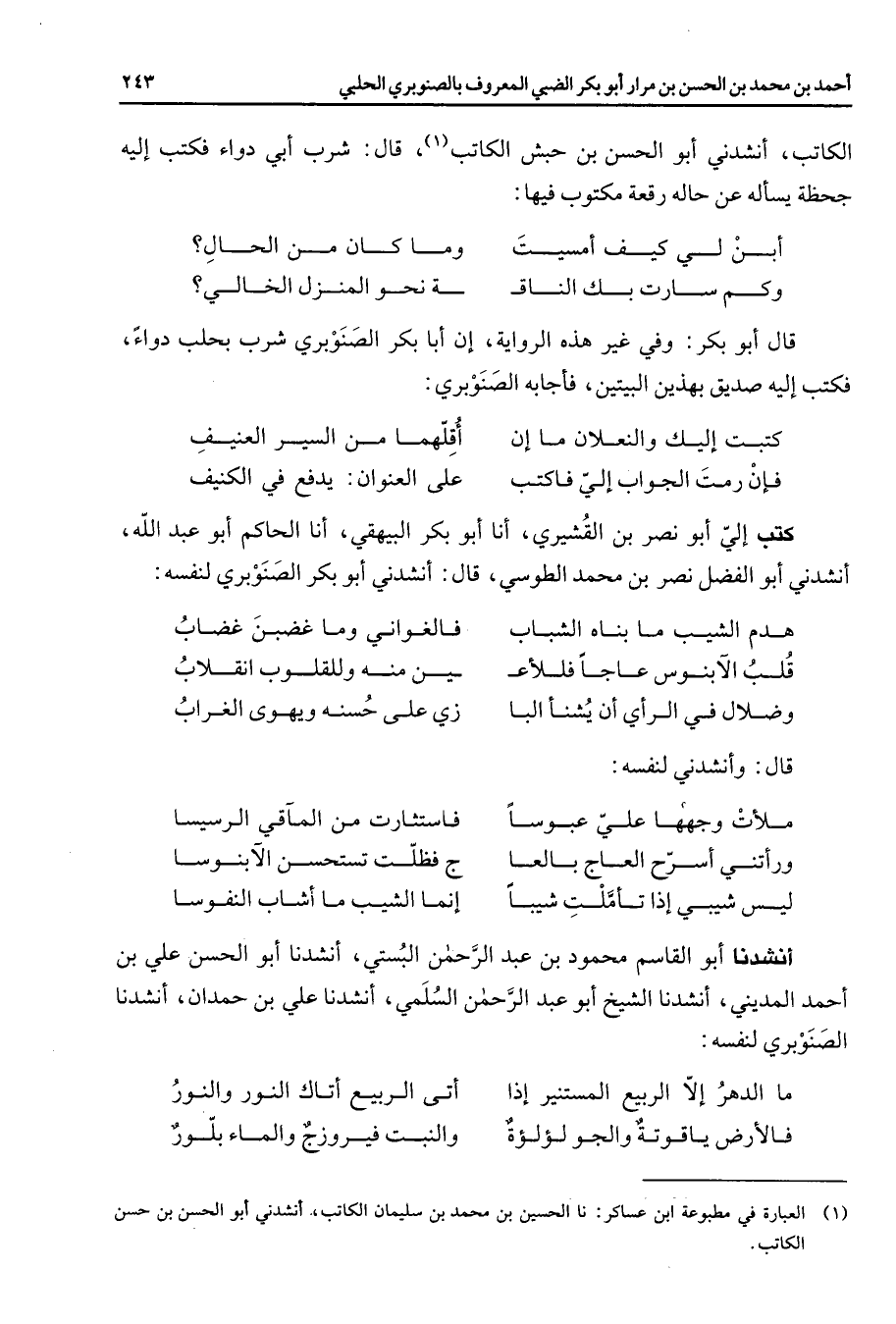 الكاتب أنشدني أبو الحسن بن حبش الكاتب (1) قال شرب أبي دواء فكتب إليه جحظة يسأله عن حاله رقعة مكتوب فيها * أبن لي كيف أمسيت * وما كان من الحال وكم سارت بك الناق * ة نحو المنزل الخالي * قال أبو بكر وفي غير هذه الرواية إن أبا بكر الصنوبري شرب بحلب دواء فكتب إليه صديق بهذين البيتين فأجابه الصنوبري * كتبت إليك والنعلان ما إن * أقلهما من السير العنيف فإن رمت الجواب إلي فاكتب * على العنوان يدفع في الكنيف * كتب إلى أبو نصر بن القشيري أنا أبو بكر البيهقي أنا الحاكم أبو عبد الله أنشدني أبو الفضل نصر بن محمد الطوسي قال أنشدني أبو بكر الصنوبري لنفسه * هدم الشيب ما بناه الشباب * فالغواني وما غضبن غضاب قلب الأبنوس عاجا فللأع * ين منه وللقلوب انقلاب وضلال في الرأي أن يشنأ البا * زي على حسنه ويهوى الغراب * قال وأنشدني لنفسه * ملأت وجهها علي عبوسا * فاستثارت من المآقي الرسيسا ورأتني أسرح العاج بالعا * ج فظلت تستحسن الآبنوسا ليس شيبي إذا تأملت شيبا * إنما الشيب ما أشاب النفوسا * أنشدنا أبو القاسم محمود بن عبد الرحمن البستي أنشدنا أبو الحسن علي بن أحمد المديني أنشدنا الشيخ أبو عبد الرحمن السلمي أنشدنا علي بن حمدان أنشدنا الصنوبري لنفسه * ما الدهر إلا الربيع المستنير إذا * أتى الربيع أتاك النور والنور فالأرض ياقوتة والجو لؤلؤة * والنبت فيروزج والماء بلور *