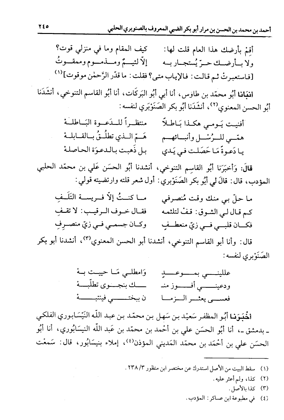 أقم بأرضك هذا العام قلت لها * كيف المقام وما في منزلي قوت ولا بأرضك حر يستجار به * إلا لئيم ومذموم وممقوت * فاستعبرت ثم قالت فالإياب متى فقلت ما قدر الرحمن موقوت (1) أنبأنا أبو محمد بن طاوس أنا أبي أبو البركات أنا أبو القاسم التنوخي أنشدنا أبو الحسن المعنوي (2) أنشدنا أبو بكر الصنوبري لنفسه * أفنيت يومي هكذا باطلا * منتظرا للدعوة الباطلة * * همي للرسل وأنبائهم * هم الذي تطلق بالقابلة يا دعوة ما حصلت في يدي * بل ذهبت بالدعوة الحاصلة * قال وأخبرنا أبو القاسم التنوخي أنشدنا أبو الحسن علي بن محمد الحلبي المؤدب قال قال لي أبو بكر الصنوبري أو شعر قلته وارتضيته قولي * ما حل بي منك وقت منصرفي * ما كنت إلا فريسة التلف كم قال لي الشوق قف لتلثمه * فقال خوف الرقيب لا تقف فكان قلبي في زي منعطف * وكان جسمي في زي منصرف * قال وأنا أبو القاسم التنوخي أنشدنا أبو الحسن المعنوي (3) أنشدنا أبو بكر الصنوبري لنفسه * علليني بموعد * وامطلي ما حييت به ودعيني أفوز من * ك بنجوى تطلبه فعسى يعثر الزما * ن ببختي فينتبه * أخبرنا أبو المظفر سعيد بن سهل بن محمد بن عبد الله النيسابوري الفلكي بدمشق أنا أبو الحسن علي بن أحمد بن محمد بن عبد الله النيسابوري أنا أبو الحسن علي بن أحمد بن محمد المديني المؤذن (4) إملاء بنيسابور قال سمعت
