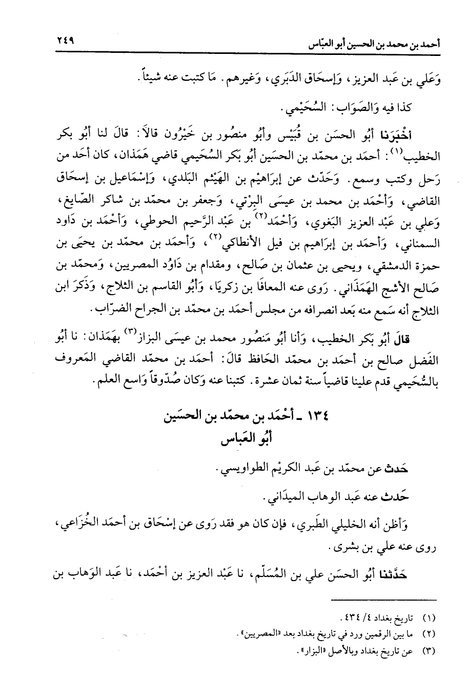 134 - أحمد بن محمد بن الحسين أبو العباس حدث عن محمد بن عبد الكريم الطواويسي حدث عنه عبد الوهاب الميداني وأظن أنه الخليلي الطبري فإن كان هو فقد روى عن إسحاق بن أحمد الخزاعي روى عنه علي بن بشرى حدثنا أبو الحسن علي بن المسلم نا عبد العزيز بن أحمد نا عبد الوهاب بن