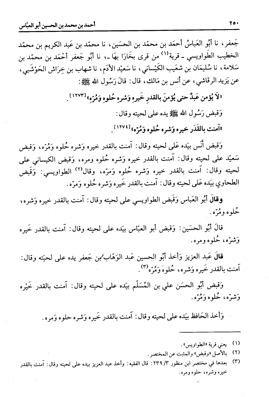 جعفر نا أبو العباس أحمد بن محمد بن الحسين نا محمد بن عبد الكريم بن محمد الخطيب الطواويسي قرية (1) من قرى بخارا بها نا أبو جعفر أحمد بن محمد بن سلامة نا سليمان بن شعيب الكيساني نا سعيد الآدم نا شهاب بن خراش الحوشبي عن يزيد الرقاشي عن أنس بن مالك قال قال رسول الله (صلى الله عليه وسلم) لا يؤمن عبد حتى يؤمن بالقدر خيره وشره حلوه ومره وقبض رسول الله (صلى الله عليه وسلم) بيده على لحيته وقال آمنت بالقدر خيره وشره وحلوه ومره وقبض أنس بيده على لحيته وقال آمنت بالقدر خيره وشره حلوه ومره وقبض سعيد على لحيته وقال آمنت بالقدر خيره وشره حلوه ومره وقبض الكيساني على لحيته وقال آمنت بالقدر خيره وشره حلوه ومره وقال (2) الطواويسي وقبض الطحاوي بيده على لحيته وقال آمنت بالقدر خيره وشره حلوه ومره وقال أبو العباس وقبض الطواويسي على لحيته وقال آمنت بالقدر خيره وشره حلوه ومره قال أبو الحسين وقبض أبو العباس بيده على لحيته وقال آمنت بالقدر خيره وشره حلوه ومره قال عبد العزيز وأخذ أبو الحسين عبد الوهاب بن جعفر يده على لحيته وقال آمنت بالقدر خيره وشره حلوه ومره (3) وقبض أبو الحسن علي بن المسلم بيده على لحيته وقال آمنت بالقدر خيره وشره حلوه ومره وأخذ الحافظ بيده على لحيته وقال آمنت بالقدر خيره وشره وحلوه ومره
