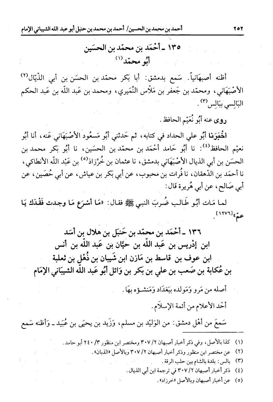 135 - أحمد بن محمد بن الحسين أبو محمد (1) أظنه أصبهانيا سمع بدمشق أبا بكر محمد بن الحسن بن أبي الذيال (2) الأصبهاني ومحمد بن جعفر بن ملاس النميري ومحمد بن عبد الله بن عبد الحكم البالسي ببالس (3) روى عنه أبو نعيم الحافظ أخبرنا أبو علي الحداد في كتابه ثم حدثني أبو مسعود الأصبهاني عنه أنا أبو نعيم الحافظ (4) نا أبو حامد أحمد بن محمد بن الحسين نا أبو بكر محمد بن الحسن بن أبي الذيال الأصبهاني بدمشق نا عثمان بن خرزاذ (5) بن عبد الله الأنطاكي نا أحمد بن الدهقان نا فرات بن محبوب عن أبي بكر بن عياش عن أبي حصين عن أبي صالح عن أبي هريرة قال لما مات أبو طالب ضرب النبي (صلى الله عليه وسلم) فقال ما أسرع ما وجدت فقدك يا عم
