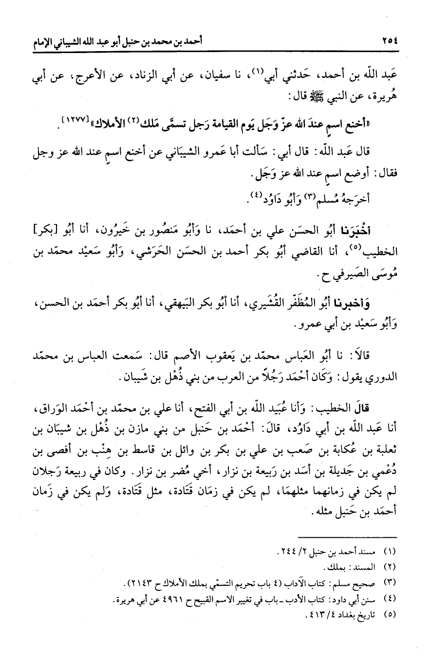 عبد الله بن أحمد حدثني أبي (1) نا سفيان عن أبي الزناد عن الأعرج عن أبي هريرة عن النبي (صلى الله عليه وسلم) قال أخنع اسم عند الله عز وجل يوم القيامة رجل تسمى ملك (2) الأملاك قال عبد الله قال أبي سألت أبا عمرو الشيباني عن أخنع اسم عند الله عز وجل فقال أوضع اسم عند الله عز وجل - أخرجه مسلم (3) وأبو داود (4) أخبرنا أبو الحسن علي بن أحمد نا وأبو منصور بن خيرون أنا أبو بكر الخطيب (5) أنا القاضي أبو بكر أحمد بن الحسن الحرشي وأبو سعيد محمد بن موسى الصيرفي وأخبرنا أبو المظفر القشيري أنا أبو بكر البيهقي أنا أبو بكر أحمد بن الحسن وأبو سعيد بن أبي عمرو قالا نا أبو العباس محمد بن يعقوب الأصم قال سمعت العباس بن محمد الدوري يقول وكان أحمد رجلا من العرب من بني ذهل بن شيبان قال الخطيب وأنا عبيد الله بن أبي الفتح أنا علي بن محمد بن أحمد الوراق أنا عبد الله بن أبي داود قال أحمد بن حنبل من بني مازن بن ذهل بن شيبان بن ثعلبة بن عكابة بن صعب بن علي بن بكر بن وائل بن قاسط بن هنب بن أفصى بن دعمي بن جديلة بن اسد بن ربيعة بن نزار أخي مضر بن نزار وكان في ربيعة رجلان لم يكن في زمانهما مثلهما لم يكن في زمان قتادة مثل قتادة ولم يكن في زمان أحمد بن حنبل مثله