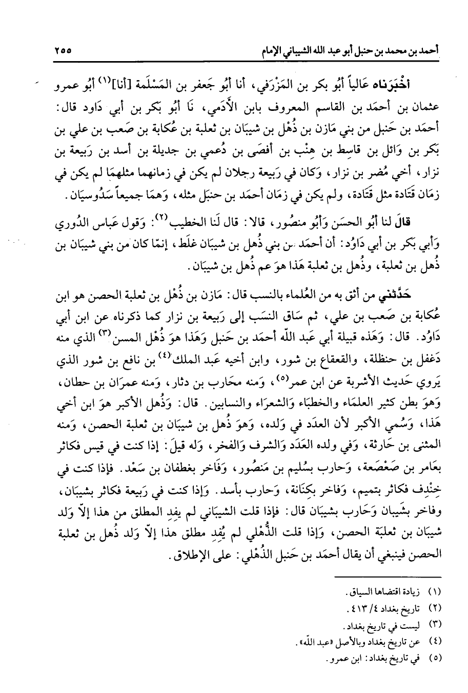 أخبرناه عاليا أبو بكر بن المزرفي أنا أبو جعفر بن المسلمة أنا (1) أبو عمرو عثمان بن أحمد بن القاسم المعروف بابن الأدمي نا أبو بكر بن أبي داود قال أحمد بن حنبل من بني مازن بن ذهل بن شيبان بن ثعلبة بن عكابة بن صعب بن علي بن بكر بن وائل بن قاسط بن هنب بن أفصى بن دعمي بن جديلة بن أسد بن ربيعة بن نزار أخي مضر بن نزار وكان في ربيعة رجلان لم يكن في زمانهما مثلهما لم يكن في زمان قتادة مثل قتادة ولم يكن في زمان أحمد بن حنبل مثله وهما جميعا سدوسيان قال لنا أبو الحسن وأبو منصور قالا قال لنا الخطيب (2) وقول عباس الدوري وأبي بكر بن أبي داود أن أحمد من بني ذهل بن شيبان غلط إنما كان من بني شيبان بن ذهل بن ثعلبة وذهل بن ثعلبة هذا هو عم ذهل بن شيبان حدثني من أثق به من العلماء بالنسب قال مازن بن ذهل بن ثعلبة الحصن هو ابن عكابة بن صعب بن علي ثم ساق النسب إلى ربيعة بن نزار كما ذكرناه عن ابن أبي داود قال وهذه قبيلة أبي عبد الله أحمد بن حنبل وهذا هو ذهل المسن (3) الذي منه دغفل بن حنظله والقعقاع بن شور وابن أخيه عبد الملك (4) بن نافع بن شور الذي يروي حديث الأشربة عن ابن عمر (5) ومنه محارب بن دثار ومنه عمران بن حطان وهو بطن كثير العلماء والخطباء والشعراء والنسابين قال وذهل الأكبر هو ابن أخي هذا وسمي الأكبر لأن العدد في ولده وهو ذهل بن شيبان بن ثعلبة الحصن ومنه المثنى بن حارثة وفي ولده العدد والشرف والفخر وله قيل إذا كنت في قيس فكاثر بعامر بن صعصعة وحارب بسليم بن منصور وفاخر بغطفان بن سعد فإذا كنت في خندف فكاثر بتميم وفاخر بكنانة وحارب بأسد وإذا كنت في ربيعة فكاثر بشيبان وفاخر بشيبان وحارب بشيبان قال فإذا قلت الشيباني لم يفد المطلق من هذا إلا ولد شيبان بن ثعلبة الحصن وإذا قلت الذهلي لم يفد مطلق هذا إلا ولد ذهل بن ثعلبة الحصن فينبغي أن يقال أحمد بن حنبل الذهلي على الإطلاق