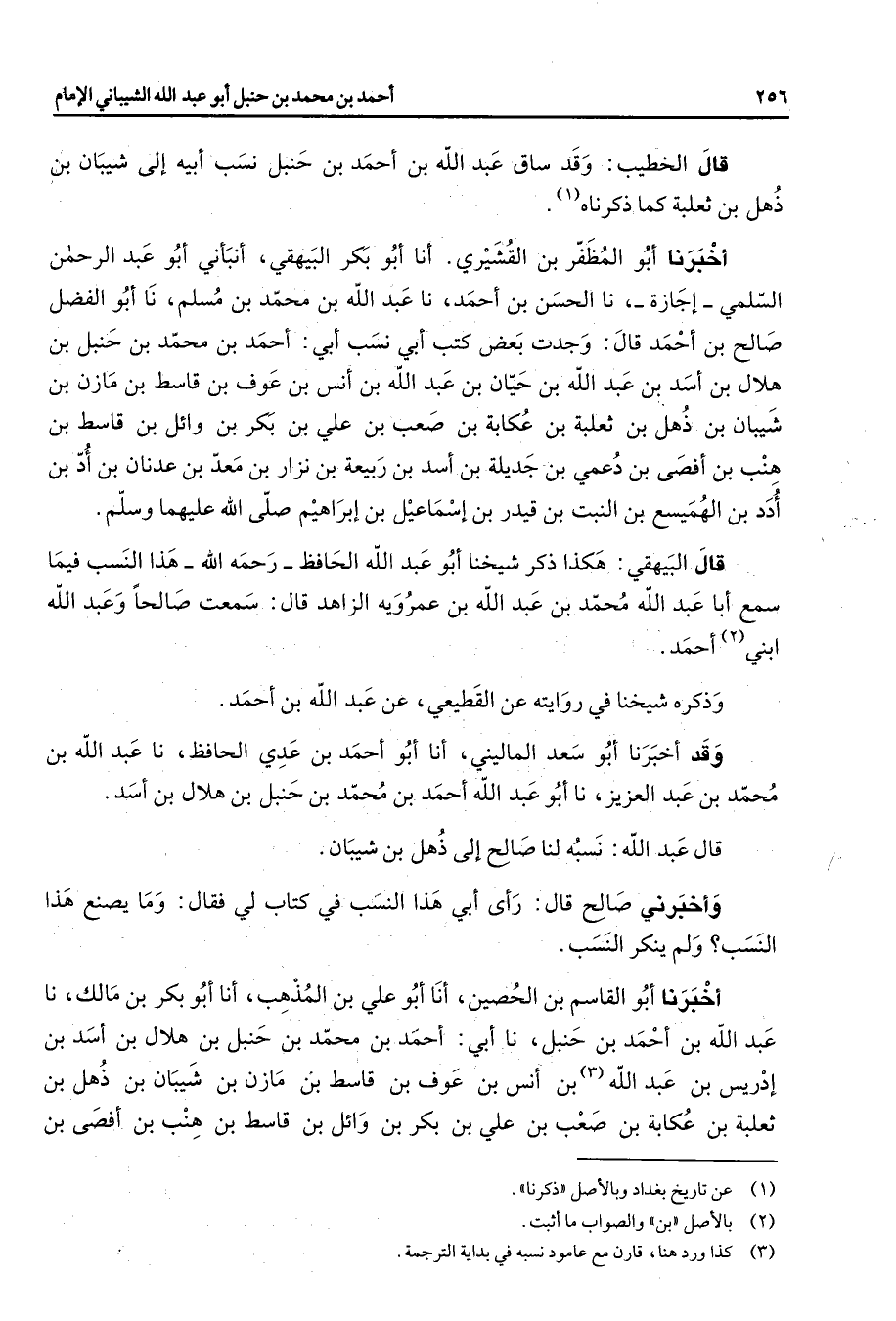 قال الخطيب وقد ساق عبد الله بن أحمد بن حنبل نسب أبيه إلى شيبان بن ذهل بن ثعلبة كما ذكرناه (1) أخبرنا أبو المظفر بن القشيري أنا أبو بكر البيهقي أنبأني أبو عبد الرحمن السلمي إجازة نا الحسن بن أحمد نا عبد الله بن محمد بن مسلم نا أبو الفضل صالح بن أحمد قال وجدت بعض كتب أبي نسب أبي أحمد بن محمد بن حنبل بن هلال بن أسد بن عبد الله بن حيان بن عبد الله بن أنس بن عوف بن قاسط بن مازن بن شيبان بن ذهل بن ثعلبة بن عكابة بن صعب بن علي بن بكر بن وائل بن قاسط بن هنب بن أفصى بن دعمي بن جديلة بن أسد بن ربيعة بن نزار بن معد بن عدنان بن أد بن أدد بن الهميسع بن النبت بن قيدر بن إسماعيل بن إبراهيم صلى الله عليهما وسلم قال البيهقي هكذا ذكر شيخنا أبو عبد الله الحافظ رحمه الله هذا النسب فيما سمع أبا عبد الله محمد بن عبد الله بن عمرويه الزاهد قال سمعت صالحا وعبد الله ابني (2) أحمد وذكره شيخنا في روايته عن القطيعي عن عبد الله بن أحمد وقد أخبرنا أبو سعد الماليني أنا أبو أحمد بن عدي الحافظ نا عبد الله بن محمد بن عبد العزيز نا أبو عبد الله أحمد بن محمد بن حنبل بن هلال بن أسد قال عبد الله نسبه لنا صالح إلى ذهل بن شيبان وأخبرني صالح قال رأى أبي هذا النسب في كتاب لي فقال وما يصنع هذا النسب ولم ينكر النسب أخبرنا أبو القاسم بن الحصين أنا أبو علي بن المذهب أنا أبو بكر بن مالك نا عبد الله بن أحمد بن حنبل نا أبي أحمد بن محمد بن حنبل بن هلال بن أسد بن إدريس بن عبد الله (3) بن أنس بن عوف بن قاسط بن مازن بن شيبان بن ذهل بن ثعلبة بن عكابة بن صعب بن علي بن بكر بن وائل بن قاسط بن هنب بن أفصى بن