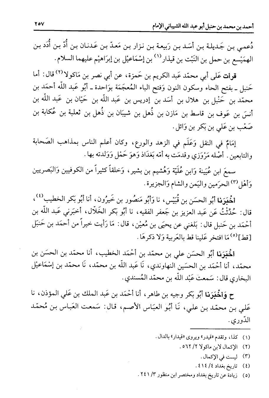دعمي بن جديلة بن أسد بن ربيعة بن نزار بن معد بن عدنان بن أد بن أدد بن الهميسع بن حمل بن النبت بن قيذار (1) بن إسماعيل بن إبراهيم عليهما السلام قرأت على أبي محمد عبد الكريم بن حمزة عن أبي نصر بن ماكولا (2) قال أما حنبل بفتح الحاء وسكون النون وفتح الباء المعجمة بواحدة أبو عبد الله أحمد بن محمد بن حنبل بن هلال بن أسد بن إدريس بن عبد الله بن حيان بن عبد الله بن أنس بن عوف بن قاسط بن مازن بن ذهل بن شيبان بن ذهل بن ثعلبة بن عكابة بن صعب بن علي بن بكر بن وائل إمام في النقل وعلم في الزهد والورع وكان أعلم الناس بمذاهب الصحابة والتابعين أصله مروزي وقدمت به أمه بغداذ وهو حمل وولدته بها سمع ابن عيينة وابن عليه وهشيم بن بشير وخلقا كثيرا من الكوفيين والبصريين وأهل (3) الحرمين واليمن والشام والجزيرة أخبرنا أبو الحسن بن قبيس نا وأبو منصور بن خيرون أنا أبو بكر الخطيب (4) قال حدثت عن عبد العزيز بن جعفر الفقيه نا أبو بكر الخلال أخبرني عبد الله بن أحمد بن حنبل قال بلغني عن يحيى بن معين قال ما رأيت خيرا من أحمد بن حنبل قط (5) ما افتخر علينا قط بالعربية ولا ذكرها أخبرا أبو الحسن علي بن محمد بن أحمد الخطيب أنا محمد بن الحسن بن محمد أنا أحمد بن الحسين النهاوندي نا عبد الله بن محمد نا محمد بن إسماعيل البخاري قال سمعت عبد الله بن محمد المسندي ح وأخبرنا أبو بكر وجيه بن طاهر أنا أحمد بن عبد الملك بن علي المؤذن نا علي بن محمد بن علي نا أبو العباس الأصم قال سمعت العباس بن محمد الدوري