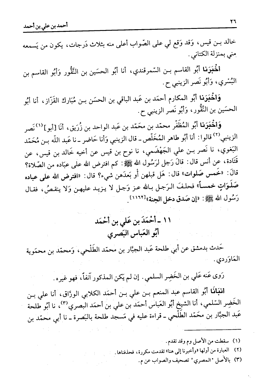 خالد بن قيس وقد وقع لي على الصواب أعلى منه بثلاث درجات يكون من يسمعه مني بمنزلة الكتاني أخبرنا أبو القاسم بن السمرقندي أنا أبو الحسين بن النقور وأبو القاسم بن البسري وأبو نصر الزينبي وأخبرنا أبو المكارم أحمد بن عبد الباقي بن الحسن بن مبارك القزاز أنا أبو الحسين بن النقور وأبو نصر الزينبي وأخبرنا أبو المظفر محمد بن محمد بن عبد الواحد بن زريق أنا [أبو] (1) نصر الزينبي (2) قالوا أنا أبو طاهر المخلص قال الزينبي وأنا حاضر نا عبد الله بن محمد البغوي نا نصر بن علي الجهضمي نا نوح بن قيس عن أخيه خالد بن قيس عن قتادة عن أنس قال قال رجل لرسول الله (صلى الله عليه وسلم) كم افترض الله على عباده من الصلاة قال خمس صلوات قال هل قبلهن أو بعدهن شئ قال افترض الله على عباده صلوات خمسا فحلف الرجل بالله عز وجل لا يزيد عليهن ولا ينقص فقال رسول الله (صلى الله عليه وسلم) إن صدق دخل الجنة