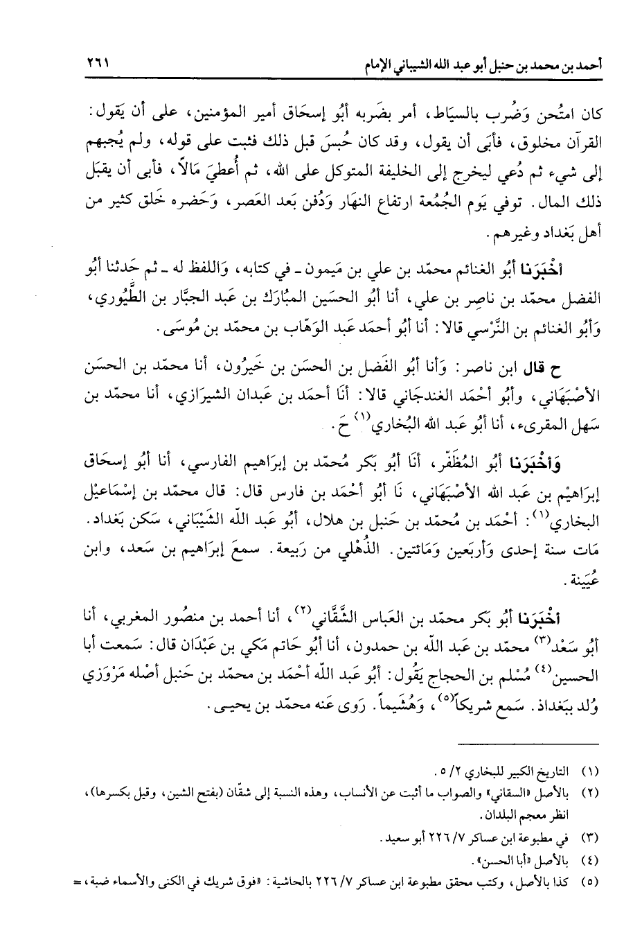كان امتحن وضرب بالسياط أمر بضربه أبو إسحاق أمير المؤمنين على أن يقول القرآن مخلوق فأبى أن يقول وقد كان حبس قبل ذلك فثبت على قوله ولم يجبهم إلى شئ ثم دعي ليخرج إلى الخيلفة المتوكل على الله ثم أعطي مالا فأبى أن يقبل ذلك المال توفي يوم الجمعة ارتفاع النهار ودفن بعد العصر وحضره خلق كثير من أهل بغداد وغيرهم أخبرنا أبو الغنائم محمد بن علي بن ميمون في كتابه واللفظ له ثم حدثنا أبو الفضل محمد بن ناصر بن علي أنا أبو الحسين المبارك بن عبد الجبار بن الطيوري وأبو الغنائم بن النرسي قالا أنا أبو أحمد عبد الوهاب بن محمد بن موسى ح قال أبن ناصر وأنا أبو الفضل بن الحسن بن خيرون أنا محمد بن الحسن الأصبهاني وأبو أحمد الغندجاني قالا أنا أحمد بن عبدان الشيرازي أنا محمد بن سهل المقرئ أنا أبو عبد الله البخاري (1) وأخبرنا أبو المظفر أنا أبو بكر محمد بن إبراهيم الفارسي أنا أبو إسحاق إبراهيم بن عبد الله الأصبهاني نا أبو أحمد بن فارس قال قال محمد بن إسماعيل البخاري (1) أحمد بن محمد بن حنبل بن هلال أبو عبد الله الشيباني سكن بغداد مات سنة إحدى وأربعين ومائتين الذهلي من ربيعة سمع إبراهيم بن سعد وابن عيينة أخبرنا أبو بكر محمد بن العباس الشقاني (2) أنا أحمد بن منصور المغربي أنا أبو سعد (3) محمد بن عبد الله بن حمدون أنا أبو حاتم مكي بن عبدان قال سمعت أبا الحسين (4) مسلم بن الحجاج يقول أبو عبد الله أحمد بن محمد بن حنبل أصله مروزي ولد ببغداذ سمع شريكا (5) وهشيما روى عنه محمد بن يحيى