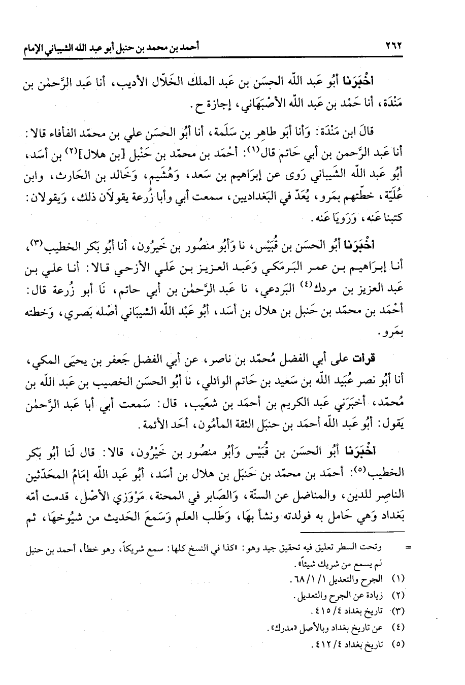 أخبرنا أبو عبد الله الحسن بن عبد الملك الخلال الأديب أنا عبد الرحمن بن منده أنا حمد بن عبد الله الأصبهاني إجازة قال ابن منده وأنا أبو طاهر بن سلمة أنا أبو الحسن علي بن محمد الفأفاء قالا أنا عبد الرحمن بن أبي حاتم قال (1) أحمد بن محمد بن حنبل بن هلال (2) بن أسد أبو عبد الله الشيباني روى عن إبراهيم بن سعد وهشيم وخالد بن الحارث وابن علية خطتهم بمرو يعد في البغداديين سمعت أبي وأبا زرعة يقولان ذلك ويقولان كتبنا عنه ورويا عنه أخبرنا أبو الحسن بن قبيس نا وأبو منصور بن خيرون أنا أبو بكر الخطيب (3) أنا إبراهيم بن عمر البرمكي وعبد العزيز بن علي الأزحي قالا أنا علي بن عبد العزيز بن مردك (4) البردعي نا عبد الرحمن بن أبي حاتم نا أبو زرعة قال أحمد بن محمد بن حنبل بن هلال بن أسد أبو عبد الله الشيباني أصله بصري وخطته بمرو قرأت على أبي الفضل محمد بن ناصر عن أبي الفضل جعفر بن يحيى المكي أنا أبو نصر عبيد الله بن سعيد بن حاتم الوائلي نا أبو الحسن الخصيب بن عبد الله بن محمد أخبرني عبد الكريم بن أحمد بن شعيب قال سمعت أبي أبا عبد الرحمن يقول أبو عبد الله أحمد بن حنبل الثقة المأمون أحد الأئمة أخبرنا أبو الحسن بن قبيس وأبو منصور بن خيرون قالا قال لنا أبو بكر الخطيب (5) أحمد بن محمد بن حنبل بن هلال بن أسد أبو عبد الله إمام المحدثين الناصر للدين والمناضل عن السنة والصابر في المحنة مروزي الأصل قدمت أمه بغداد وهي حامل به فولدته ونشأ بها وطلب العلم وسمع الحديث من شيوخها ثم