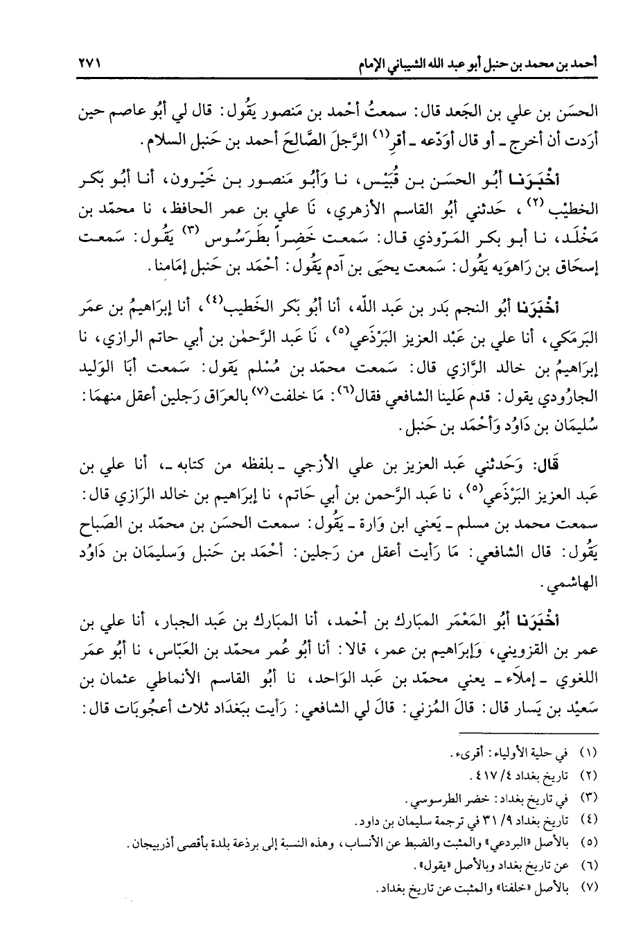 الحسن بن علي بن الجعد قال: سمعت أحمد بن منصور يقول: قال لي أبو عاصم حين أردت أن أخرج أو قال أودعه أقر (1) الرجل الصالح أحمد بن حنبل السلام أخبرنا أبو الحسن بن قبيس نا وأبو منصور بن خيرون أنا أبو بكر الخطيب (2) حدثني أبو القاسم الأزهري نا علي بن عمر الحافظ نا محمد بن مخلد نا أبو بكر المروذي قال سمعت خضرا بطرسوس (3) يقول سمعت إسحاق بن راهوية يقول سمعت يحيى بن آدم يقول أحمد بن حنبل إمامنا أخبرنا أبو النجم بدر بن عبد الله أنا أبو بكر الخطيب (4) أنا إبراهيم بن عمر البرمكي أنا علي بن عبد العزيز البرذعي (5) نا عبد الرحمن بن أبي حاتم الرازي نا إبراهيم بن خالد الرازي قال سمعت محمد بن مسلم يقول سمعت أبا الوليد الجارودي يقول قدم علينا الشافعي فقال (6) ما خلفت (7) بالعراق رجلين أعقل منهما سليمان بن داود وأحمد بن حنبل قال وحدثني عبد العزيز بن علي الأزجي بلفظه من كتابه أنا علي بن عبد العزيز البرذعي (5) نا عبد الرحمن بن أبي حاتم نا إبراهيم بن خالد الرازي قال سمعت محمد بن مسلم يعني ابن وارة يقول سمعت الحسن بن محمد بن الصباح يقول قال الشافعي ما رأيت أعقل من رجلين أحمد بن حنبل وسليمان بن داود الهاشمي أخبرنا أبو المعمر المبارك بن أحمد أنا المبارك بن عبد الجبار أنا علي بن عمر بن القزويني وإبراهيم بن عمر قالا أنا أبو عمر محمد بن العباس نا أبو عمر اللغوي إملاء يعني محمد بن عبد الواحد نا أبو القاسم الأنماطي عثمان بن سعيد بن يسار قال قال المزني قال لي الشافعي رأيت ببغداد ثلاث أعجوبات قال